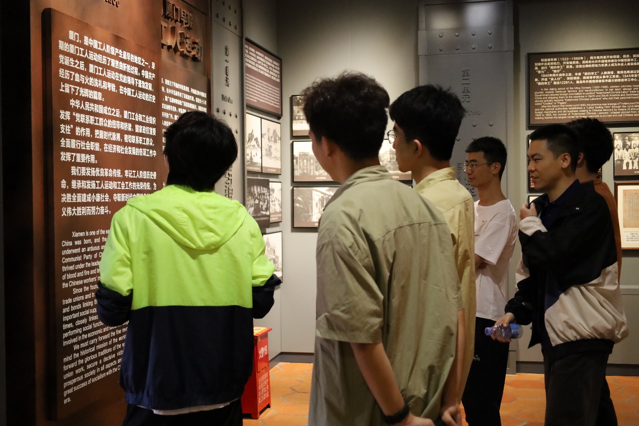 接着大家前往厦门市总工会旧址陈列馆。1927年,厦门总工会在在大同路185号的巷子里一座红砖砌筑的三层小楼里成立,掀开了厦门工人运动史的新篇章。支部党员在此倾听历史回响,追寻红色记忆。在参观过程中看到校友罗扬才烈士的雕像和事迹时,同学们无不热血澎湃,备受鼓舞。百年前,先辈烈士肩负起救亡图存的重担,将国家命运与个人命运紧密联系在一起,如今的我们更应跟随前人的脚步,站在新的起点上不忘初心、牢记使命,肩负起时代赋予的新使命,踏出属于我们的步步星光。