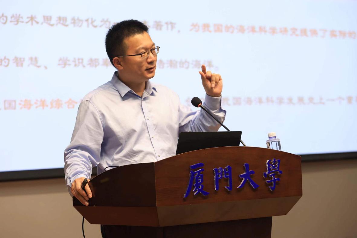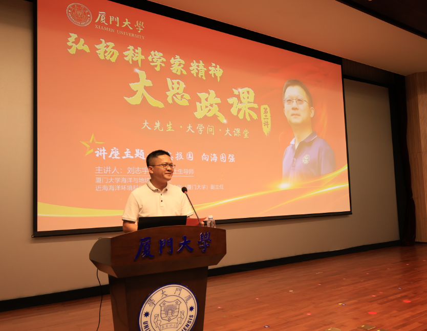 讲座中,刘志宇教授介绍了厦门大学与海洋的渊源,以及厦门大学海洋学科的发展历程,阐述了海洋科学研究的重要意义,强调了海洋在国家发展中的战略地位。在分享海洋科学家生动事迹的环节,刘志宇教授通过讲述唐世凤、赫崇本、文圣常等海洋科学家们的奋斗历程和感人故事,深刻阐释了以“爱国、创新、求实、奉献、协同、育人”为内涵的科学家精神,并提出了他对海洋学科发展与人才培养的深刻思索。