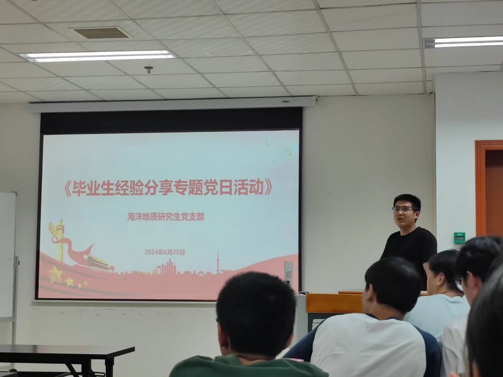 仲夏蝉鸣,桃李芬芳。为进一步做好毕业生党员教育,引导毕业生党员坚定理想信念、提升党性修养、勇于担当作为,在后续学习、工作、生活中持续发挥党员先锋模范作用,促进高低年级学生传承交流。2024年6月25日,在2024届研究生毕业之际,海洋地质研究生党支部开展“毕业生分享会”主题党日活动。海洋地质研究生党支部、海洋地质研究生团支部全体同学参与了此次活动,活动由原党支部书记朱广坤同志主持。