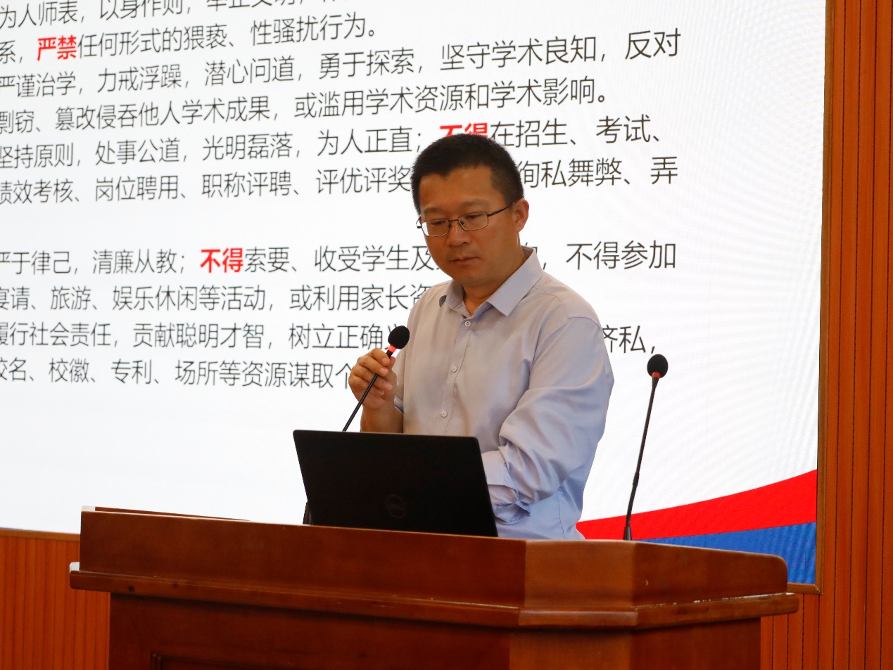 会上,刘志宇院长解读了《新时代高校教师职业行为十项准则》。他强调,党的十八大以来,党中央和国务院高度重视教师队伍建设工作,以习近平同志为核心的党中央将教师队伍建设摆在突出位置,为新时代教师队伍建设指明前进方向,对教师工作提出明确要求,明确了教师职业行为准则的红线底线。他深入阐述了《新时代高校教师职业行为十项准则》的本质内涵和具体要求,带领与会教职工认认真真学习《准则》的每一项内容,领会其重要精神,介绍了教育部关于高校教师师德失范行为处理的指导意见。