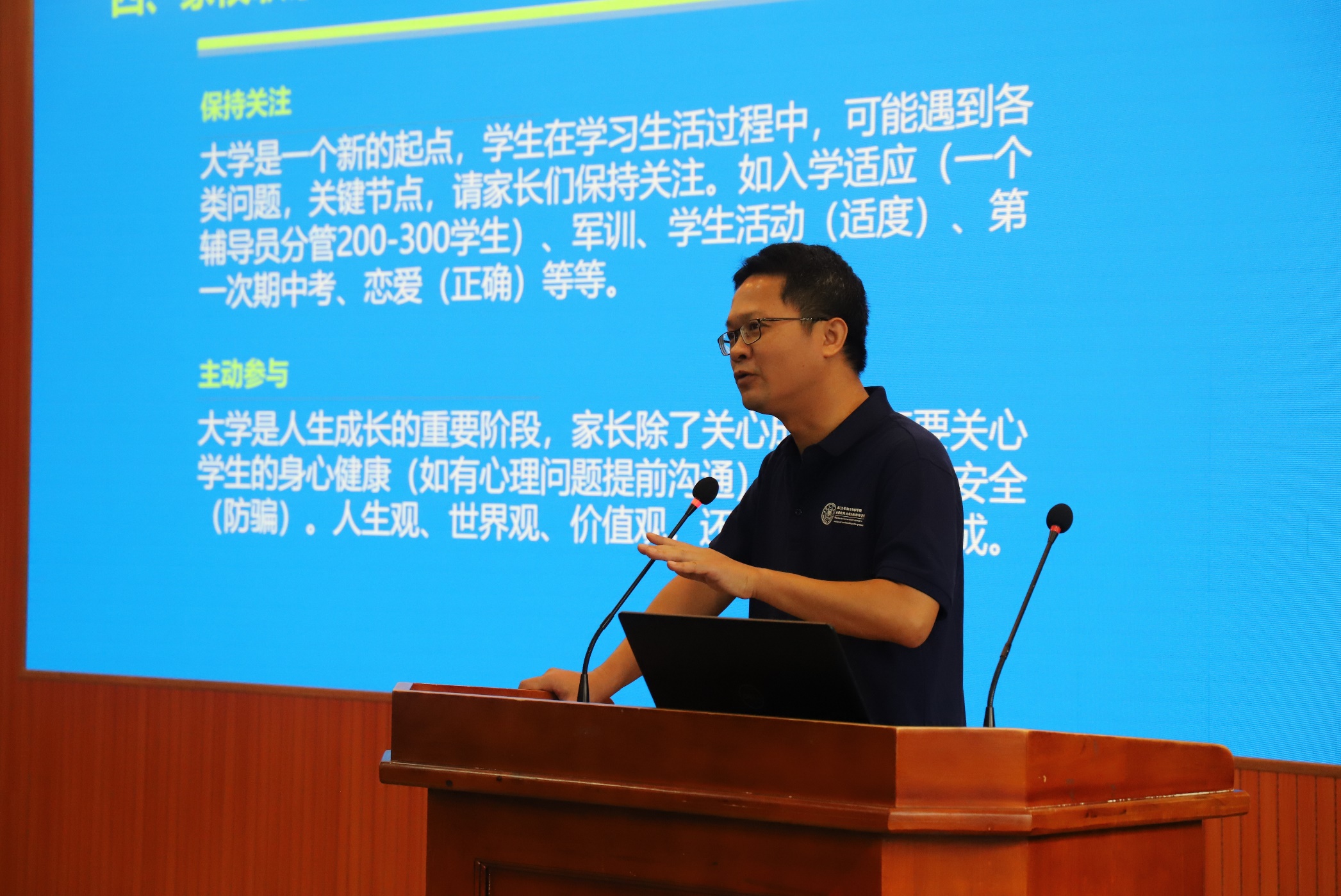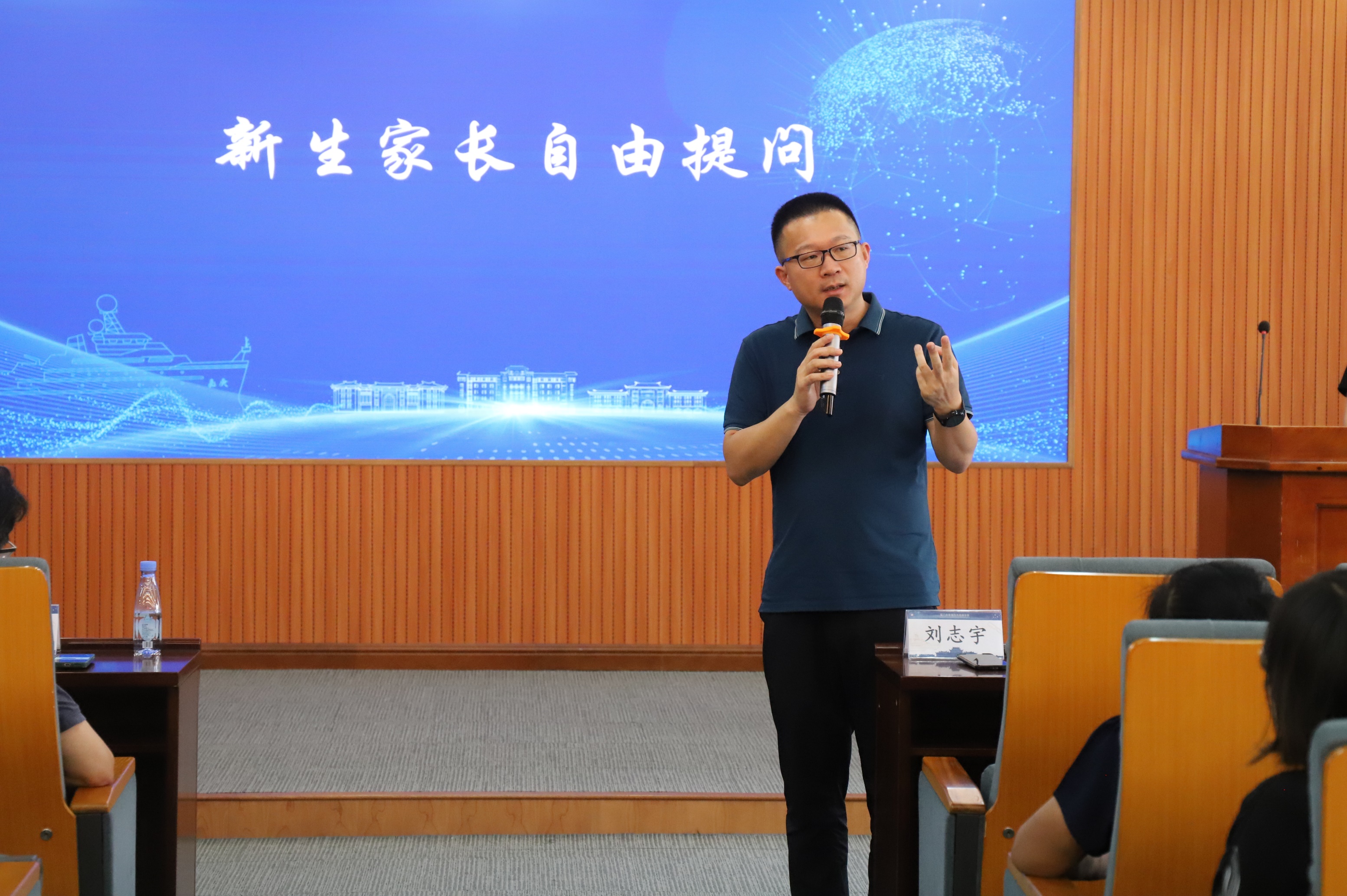 刘志宇代表学院向新生及家长致以热烈的欢迎,并对他们选择海洋学科表示衷心的感谢。他为现场家长详细介绍了学校、学院的历史沿革、办学实力、学科设置、科学研究、人才培养等方面情况,全面分析了海洋专业的广阔发展前景。他还详细分析了新生适应性学习上常见的问题和误区,并希望新生家长们要主动适应调整,与学校深度协同配合,携手助力学生成长成才。刘志宇表示,学院上下始终牢记落实立德树人根本任务,坚持以学生为中心,一定会竭尽全力培养好学生,请家长们放心!