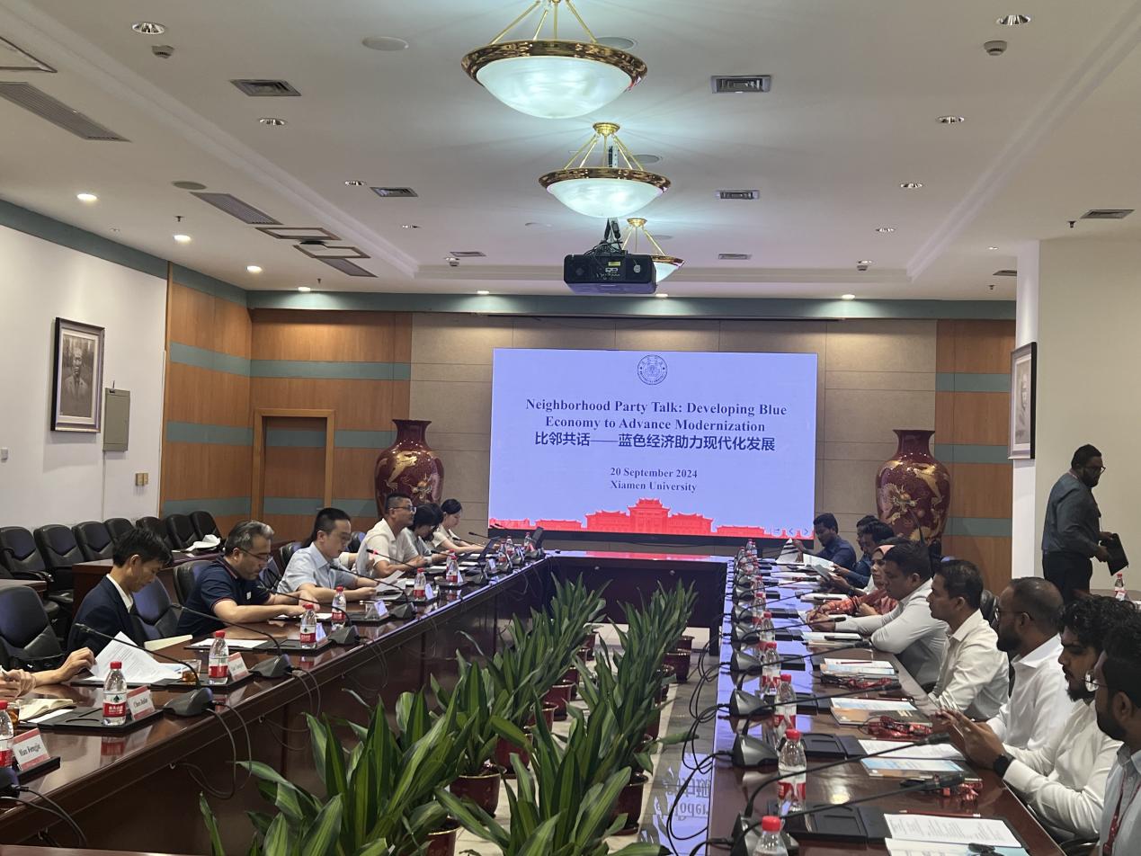 2024年9月20日,马尔代夫执政联盟干部考察团一行来访我校,与我校专家学者共聚一堂,围绕“比邻共话——蓝色经济助力现代化发展”这一主题,在思明校区颂恩楼215会议室开展交流座谈会。座谈会由厦门大学国际合作与交流处副处长蔡熙乾主持,他代表学校对考察团的到来表示热烈欢迎,并期待日后能与马尔代夫进行更多学术交流,我院副院长李骁麟教授、曹玲教授、游伟伟教授等参与会议。