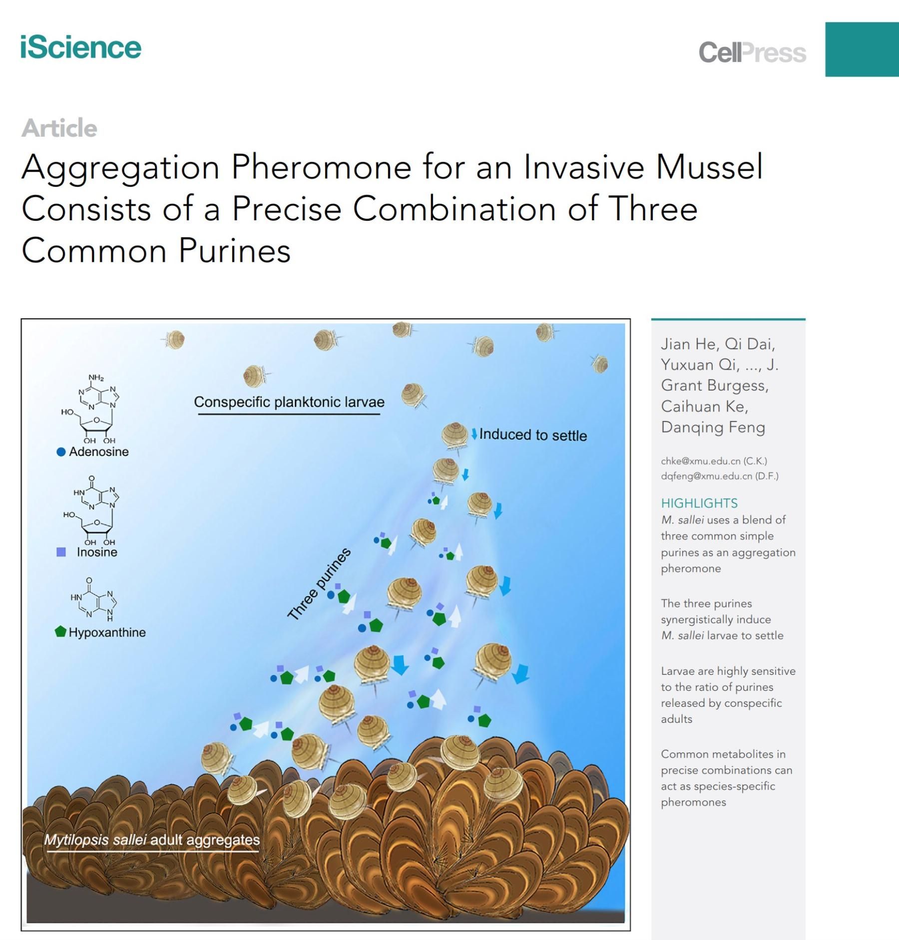 近日,我院柯才焕教授、冯丹青副教授科研团队在Cell旗下期刊iScience在线发表最新研究成果“Aggregation Pheromone for an Invasive Mussel Consists of a Precise Combination of Three Common Purines”。该研究首次在软体动物中明确鉴定出诱导幼体附着的信息素,并证实基本代谢产物以特定的配比混合可以作为诱导海洋无脊椎动物幼体附着的信号物质。