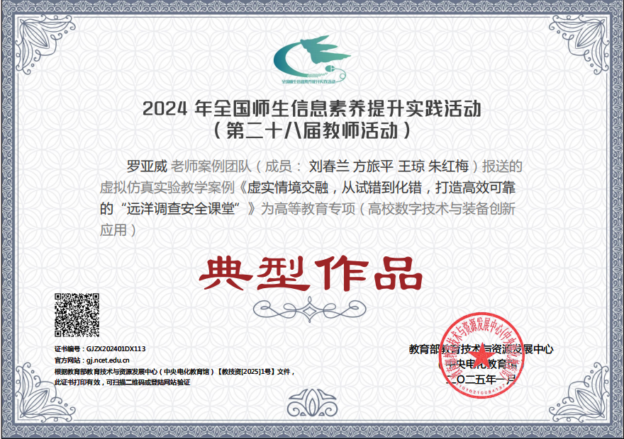 近日,教育部教育技术与资源发展中心(中央电化教育馆)发布了2024年全国师生信息素养提升实践活动(第二十八届教师活动)的评选结果。我院罗亚威教授团队报送的《虚实情境交融,从试错到化错,打造高效可靠的“远洋调查安全课堂”》入选高等教育专项(高校数字技术与装备创新应用)典型作品,这是我院在虚拟仿真实验教学方面取得的一次新突破。