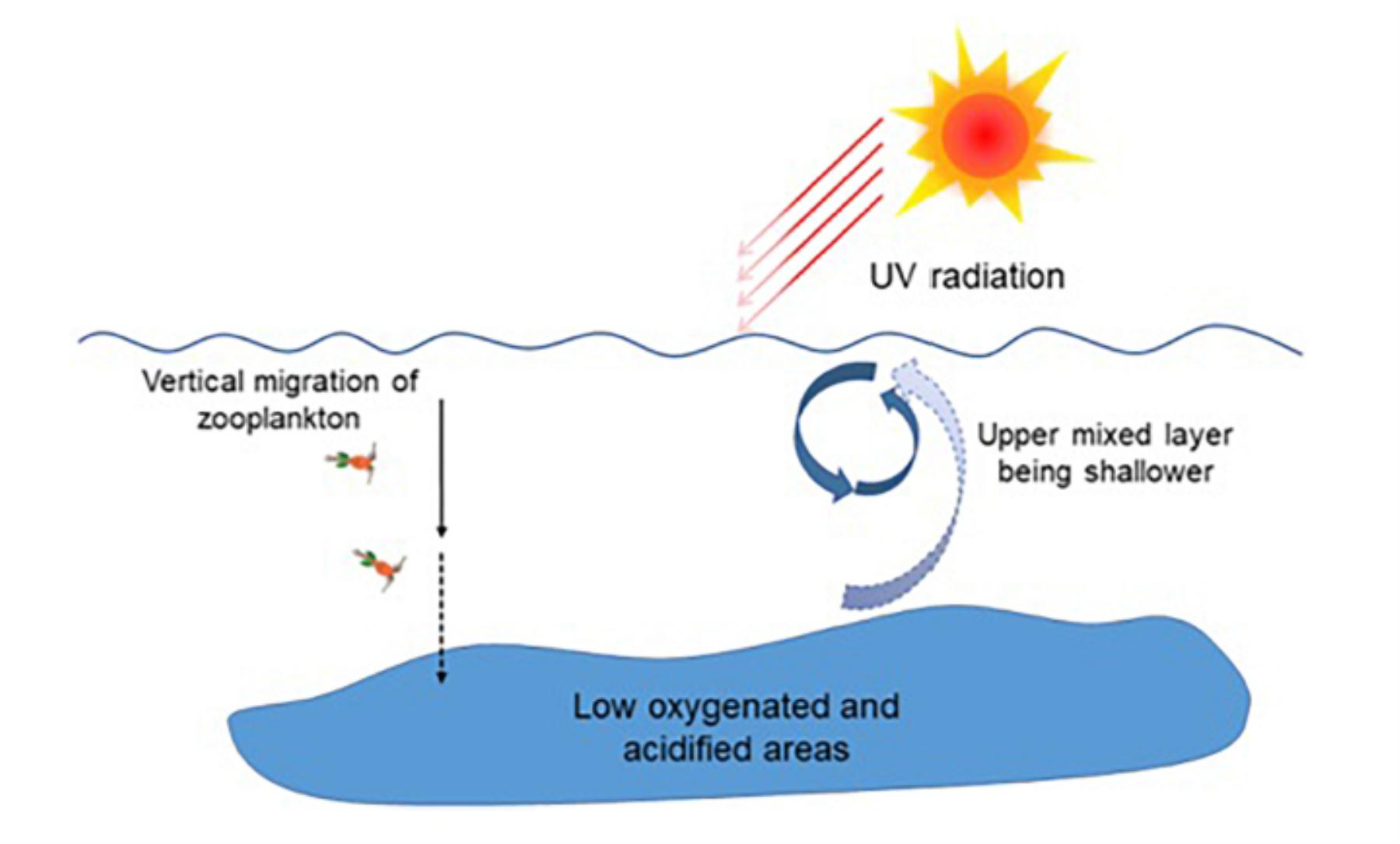 Hypothesis 1: ocean climate changes-induced habitat degradation. Ocean warming, acidification, and deoxygenation associated with increasing atmospheric CO2 rise. A shoaled upper mixed layer due to warming exposes organisms dwelling there to higher levels of solar radiation. The habitable niche degradation hypothesis: phytoplankton abundance and community structure can be altered within the UML under multiple stressors associated with ocean climate changes; and motile organisms dwelling within the UML are stressed due to increased exposure to solar UV radiation and high levels of PAR, which traps more heat; however, the low O2 and pH waters below the UML hamper downward migration.