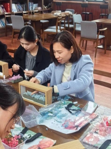 3月6日午后,翔安校区周隆泉楼咖啡厅化作艺术工坊,女教职工们暂时放下繁忙的工作,兴致勃勃地投入到干花相框的制作中。制作台上,各种颜色鲜艳、形态各异的干花琳琅满目,为相框制作提供了丰富的素材。老师们充分发挥自己的创意和想象力,精心挑选干花,仔细搭配色彩,将一朵朵干花巧妙地排列组合在相框中。有的老师偏爱淡雅的色调,用白色和淡紫色的干花营造出清新的氛围;有的老师则大胆采用色彩斑斓的搭配,红、黄、蓝等各色艳丽的干花在相框中交相辉映,制作出的相框独具特色。