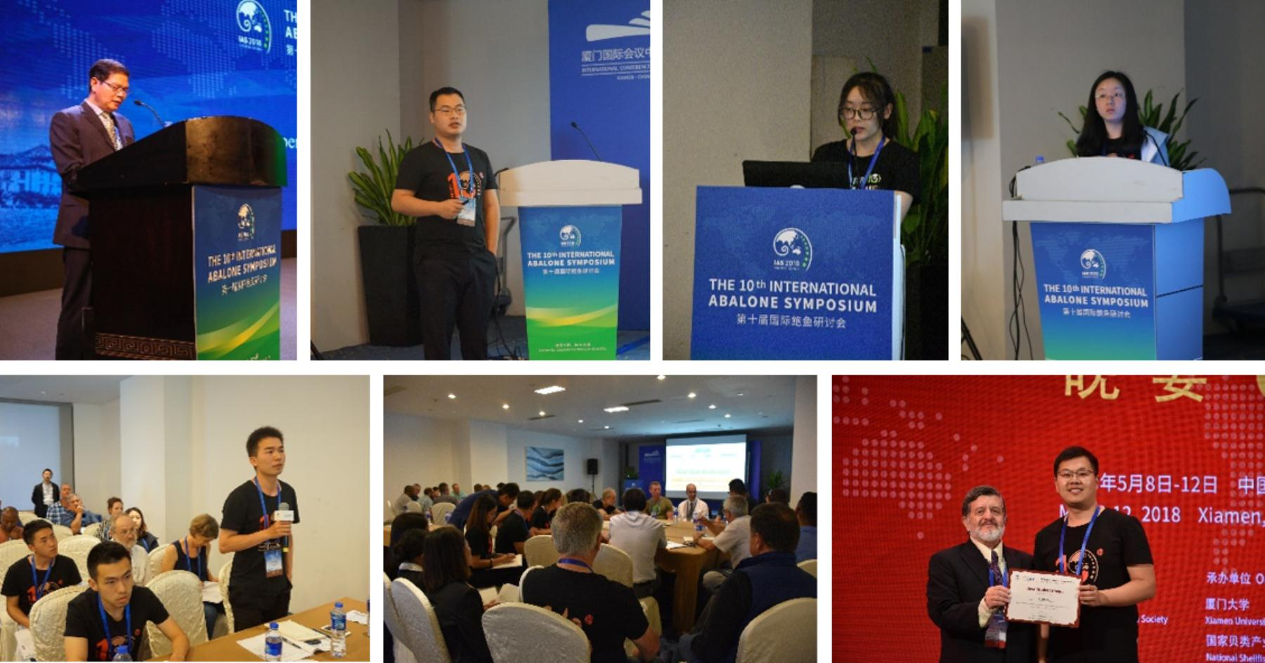 除了志愿者外,实验室的老师和学生们还要以科研工作者的身份参加到会议中去。柯才焕教授在5月9日上午做了关于“中国鲍鱼研究与产业发展前景”的大会报告,游伟伟副教授主持了一场关于“全球气候变化与鲍鱼”的专题讨论会,其余实验室成员共有10篇分会场口头报告和11篇墙报,分别就环境胁迫(高温、低氧、酸化等)、鲍基因组学与育种、鲍营养与免疫等方面进行报告,充分对外展示了厦门大学海洋底栖生物学实验室在鲍研究中所做的工作。其中,博士研究生於锋还获得了大会唯一的研究生最佳墙报奖。