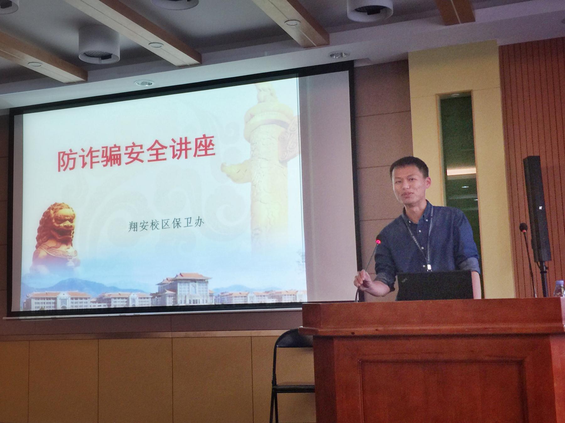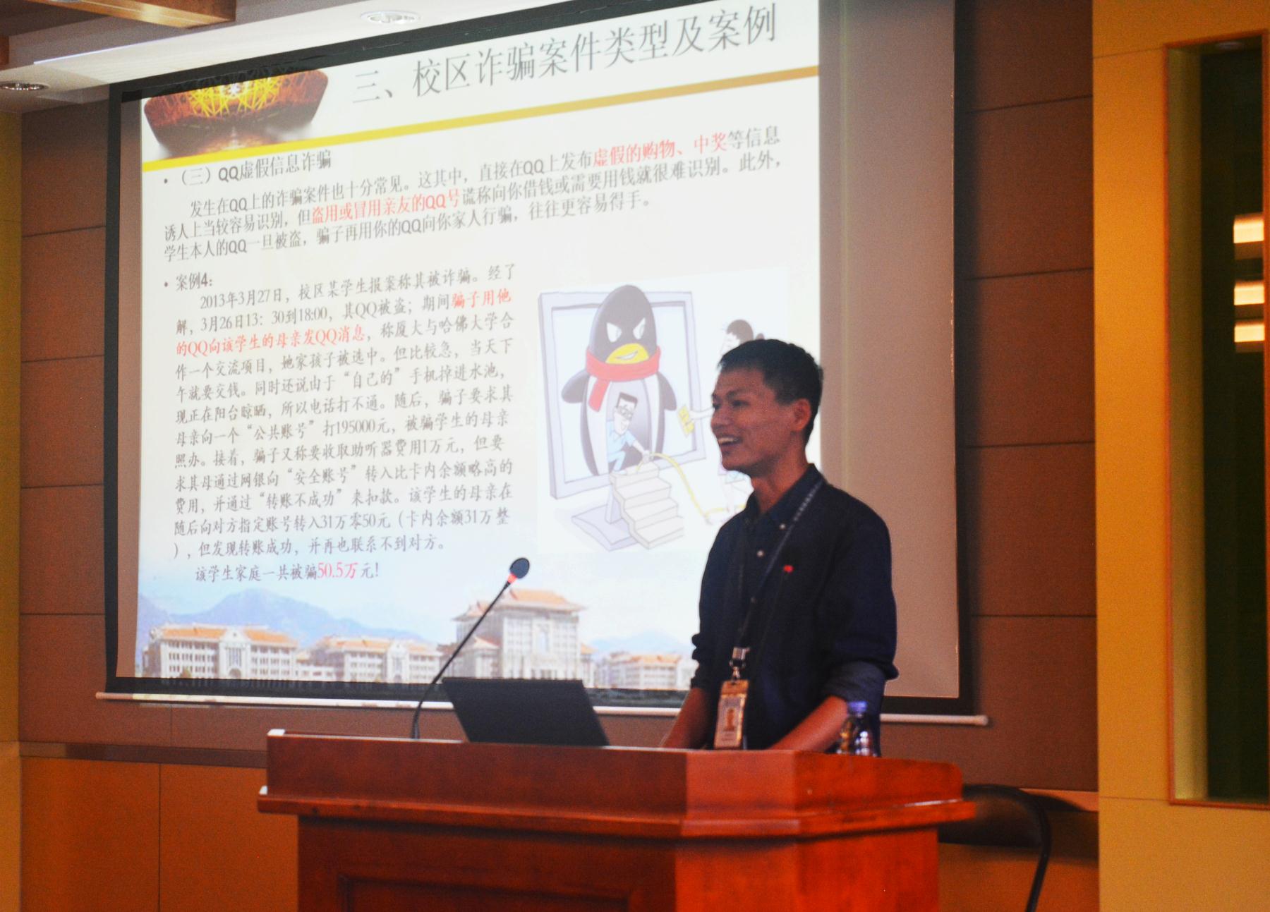 讲座中,周成明首先向同学们介绍了虚假信息诈骗具有智能化、远程异地化、职业化、团伙化等与传统犯罪不同的特点。然后以校区发生的实际案件为例,历数了一些常见的网络诈骗招数即冒充国家机关工作人员诈骗,冒充领导、老师、朋友诈骗,QQ虚假信息诈骗,银行客服短信息诈骗等。同时又以身边的真实案例提醒同学们不要大意、不要轻信、不要贪便宜。讲座最后,他总结了三个凡是:凡是自身是行政执法部门要求你转账汇款扫码的、凡是在没有认证的网站上购物、凡是通过电话网络借钱等涉及金钱的都是不安全的,遇到这些情况要学会找同学、辅导员及保卫办进行甄别,保护好自身权益。