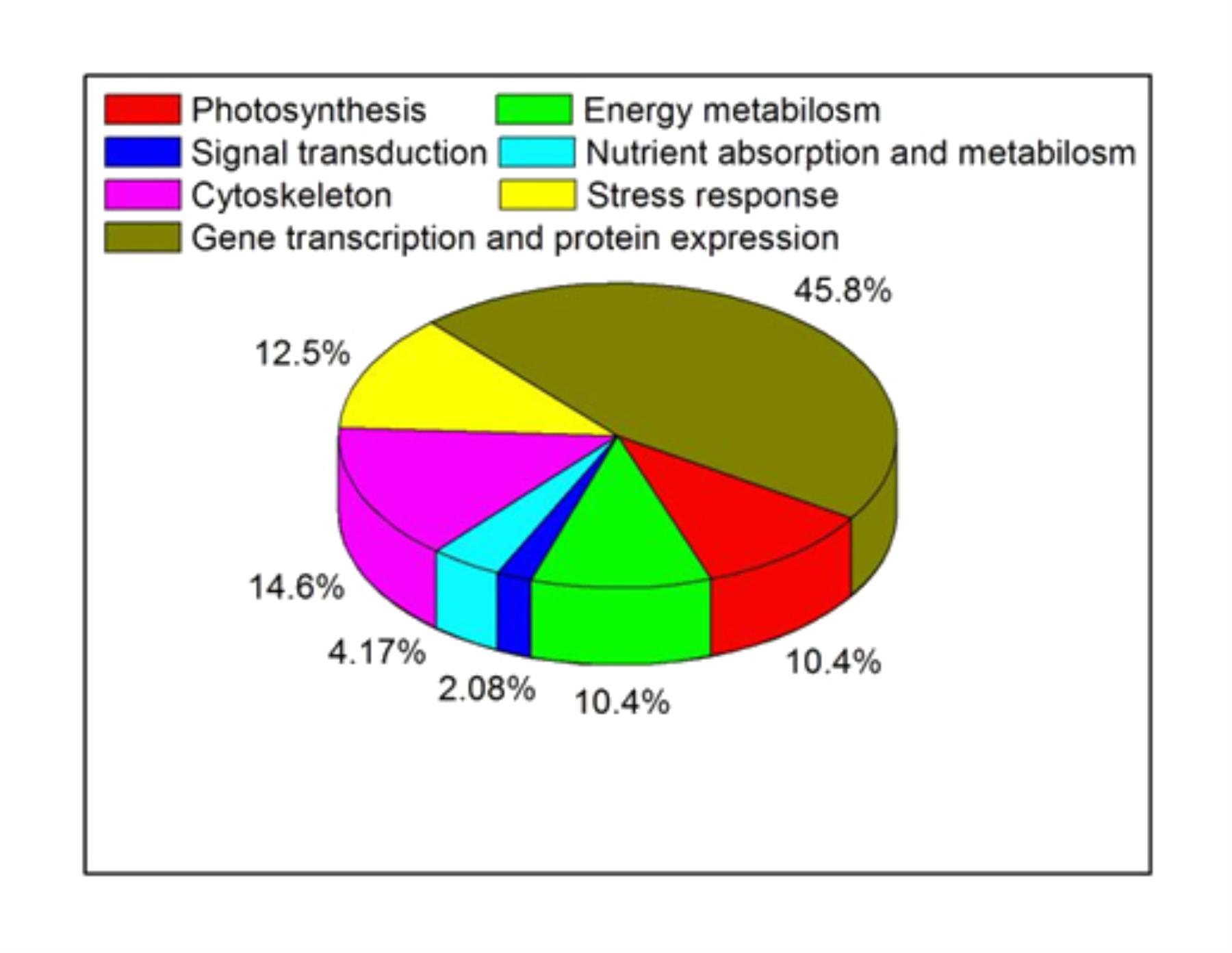 本研究将对照组(390 µatm pCO2, pHnbs: 8.13)的细胞转移到酸化条件下(1000 µatm pCO2, pHnbs:7.83),在转移后的第4、8、16、28、32、 40、 76、80、88、172、176、184 小时(其中16、40、88及184小时处于12:12光周期的暗期,其它采样点处于光周期光期)取样,进行对比性分析。结果发现,酸化条件下,该硅藻的生长显著增加,对无机碳的亲和力略有降低,与叶绿素结合蛋白、ATP合成酶、碳酸酐酶等基因的变化(酸化条件下表达量降低)密切相关。