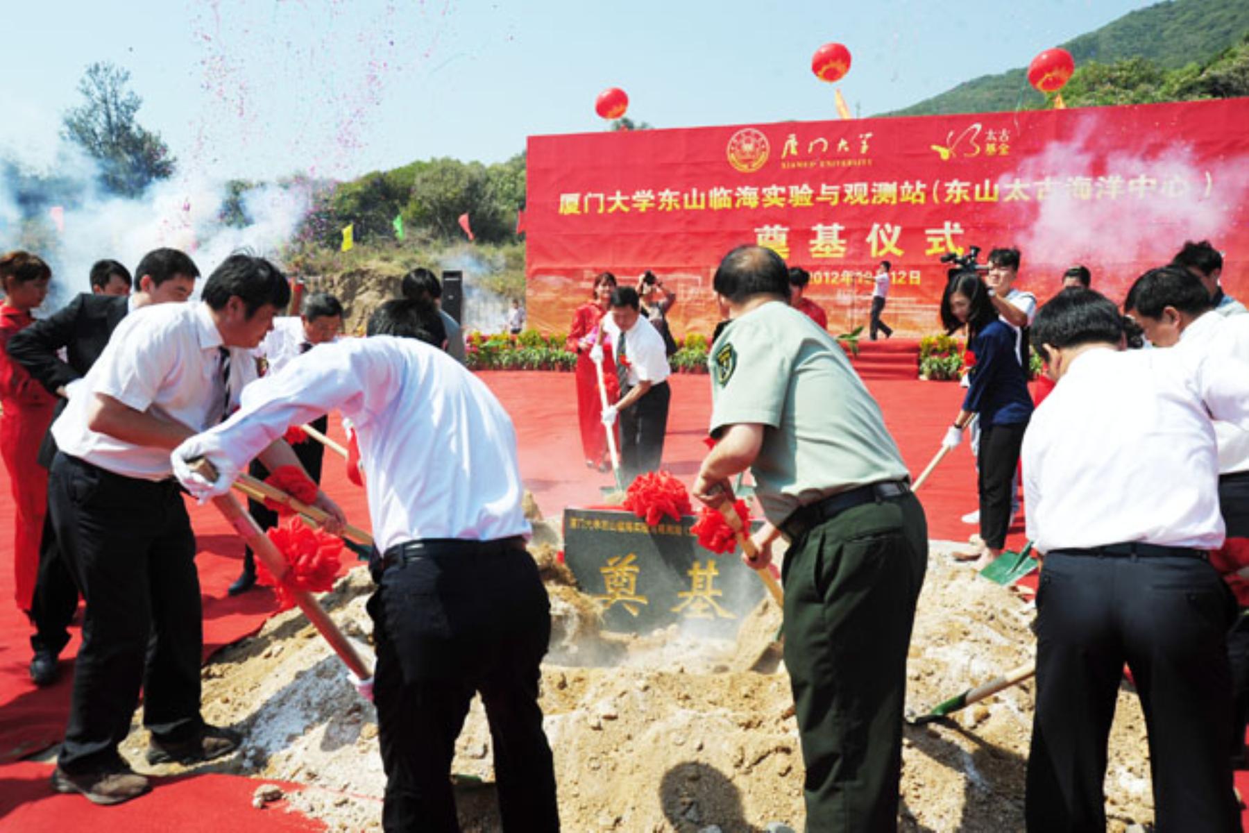 10月12日上午,我校在漳州东山县举行东山临海实验与观测站(东山太古海洋中心)(以下简称“海洋站”)奠基仪式。国家海洋局人事司巡视员、副司长周金弟,漳州市委常委、漳州市军分区政委刘茂青,东山县委书记张翼腾、县长黄水木,太古(中国)有限公司驻中国高级代表严为、公共事务经理梁巧颖,厦门大学张颖副校长及相关职能部门负责人,近海海洋环境科学国家重点实验室主任、海洋与地球学院院长戴民汉、海洋与地球学院吴立武书记、郑爱榕副院长、陈国强副书记、廖志丹副书记以及环境与生态学院的教师及学生代表参加了奠基仪式。厦门大学科技处处长李清彪主持仪式。
