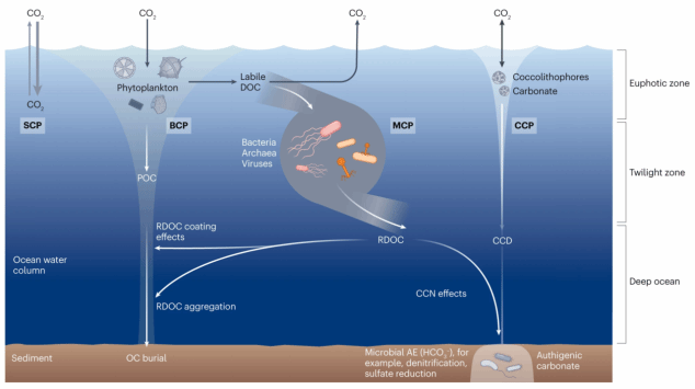 全球气候变化影响地球生命发展,但调控机制尚不清楚。焦念志院士团队通过学科交叉、古今结合,发现了地球生命与气候变化的互馈机制:(1)揭示了微型生物碳泵MCP驱动的惰性有机碳库既可在全球变暖中积累碳汇降温,亦可在冰期结束时碳源释放促暖,缓冲了对地球生命系统的冲击;(2)阐明了海洋溶解氧和酶活性主控的有机碳和无机碳迁移转化,导致雪球地球δ13C呈两阶段变化;(3)发现了铁结合有机碳在沉积物中累积循环,为微生物提供能量且调控碳收支;(4)解析了潮间带沉积物溶解有机碳多样性与微生物群落的调控机制。成果不仅为应对气候变化提供了理论引领,还为全球碳中和贡献了海洋方案。研究成果于2024年发表在《Nature Reviews Microbiology》、《Nature Communications》(2篇)和《The Innovation Geoscience》上。