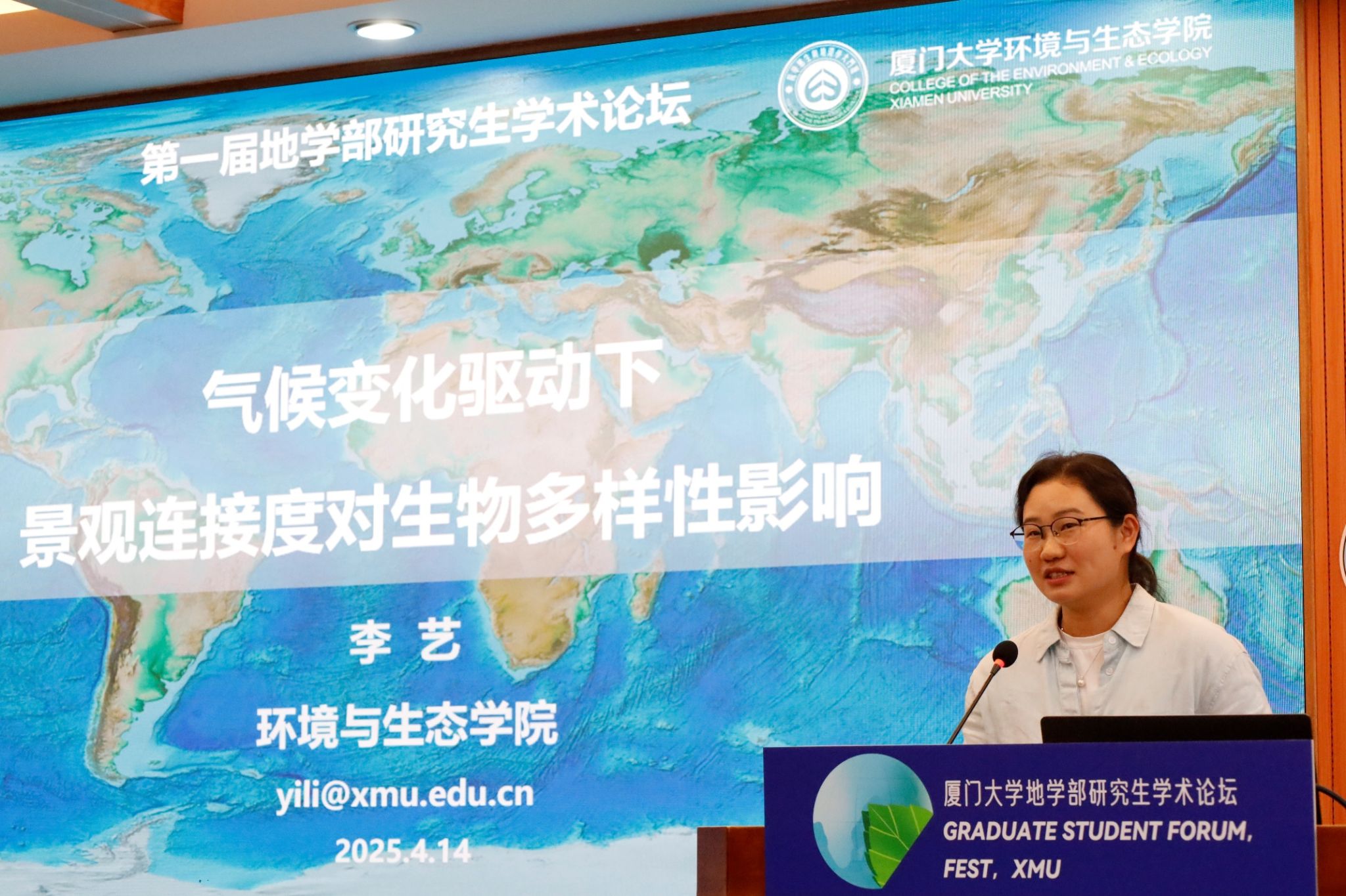 随后,三场前沿学术专题报告依次展开。环境与生态学院李艺副教授以《气候变化驱动下景观连接度对生物多样性的影响》为题,分享了其在海岸带生态遥感与城市生态恢复力领域的最新成果;海洋与地球学院白晓林副教授通过《逐浪探海·问道自然》报告,深入解析海洋多尺度动力过程与数值模拟技术的应用;环境与生态学院王伟超助理教授则聚焦《高精度铜同位素分析及其在环境健康科学中的应用》,展示了环境分析化学的前沿进展。报告结束后,与会师生积极提问,现场学术氛围热烈。