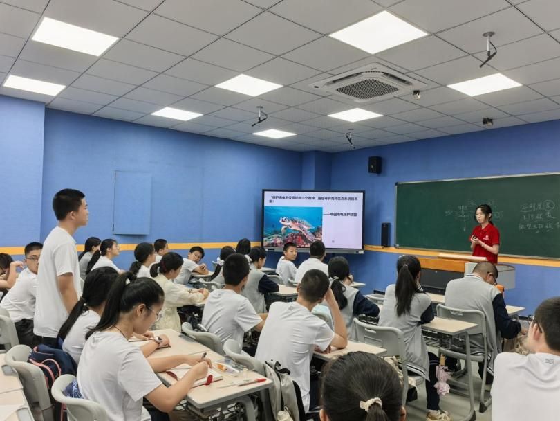 “平背龟为何不在中国分布?”“世界海龟日是哪一天?” 即时互动问答中,学生们抢答的声浪此起彼伏。当被问及 “如果地球上没有海洋,会发生什么?” 时,有人想到温度升高,有人担忧粮食危机,还有人联想到生物多样性消失,思辨与交流让课堂热度持续攀升。