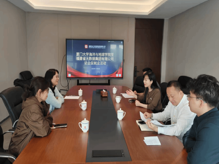 下午,调研组赴福建省大数据集团有限公司调研交流。集团人力资源部负责人徐晓清接待调研组一行,详细介绍了集团作为省级大数据龙头企业的战略定位与发展布局。双方就海洋大数据开发、数据要素市场化、政务信息化平台建设等议题交换意见。学院院友、2025届福建省引进生陈龙昱参与交流分享并表达对母校的感激之情。唐腾凤表示,期待未来围绕“智慧海洋”模块,在海洋数据资源共享、科研平台共建、学生实习就业等方面开展深度合作,共同服务数字福建与海洋强省建设。集团中层正职级干部赵宁辉、人力资源部副经理连伟伟出席了本次座谈会。