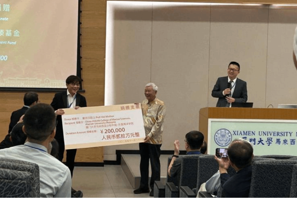 11月28日,厦门大学马来西亚分校在全球海洋华人科学会议上举行“中国—东盟海洋学院教育发展专项基金”捐赠仪式。厦门大学1983级海洋系校友、厦门大学校务委员会副主任、地球科学与技术学部主任、海洋生物地球化学全国重点实验室名誉主任、中国—东盟海洋学院国际规划顾问委员会主席戴民汉院士,1980级化学系校友、云南校友会会长、云南祥华教育集团董事长高龙之子高湘明先生,马来西亚分校校长王瑞芳教授,海洋与地球学院院长、中国—东盟海洋学院院长刘志宇教授等嘉宾出席本次活动。仪式由刘志宇主持。