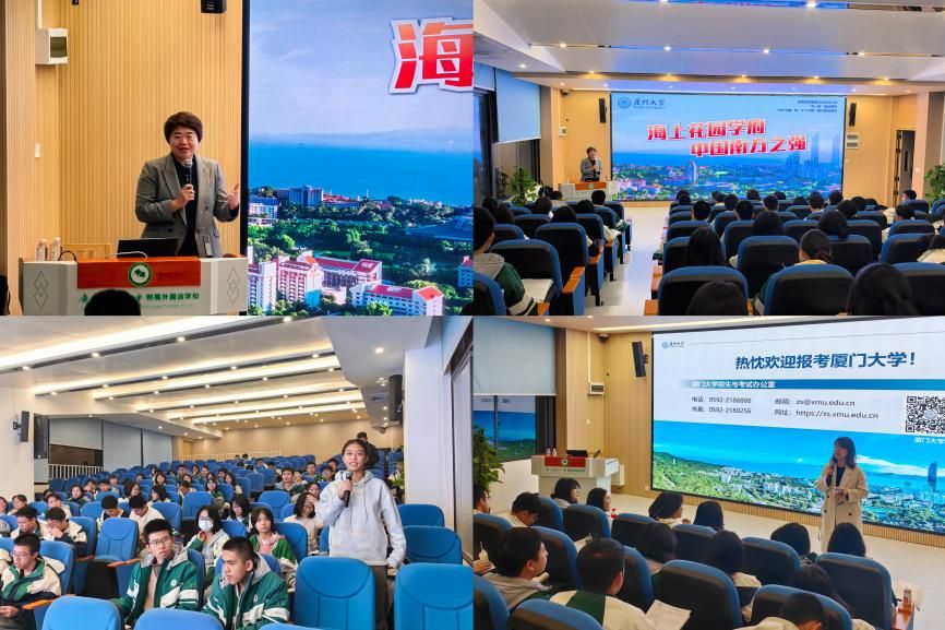 在广西师范大学附属外国语学校,刘艳杰为近百名高一学生作专场宣讲,详细解读了厦门大学的办学定位、学科优势、人才培养模式、就业前景及招生政策,并着重介绍了海洋与地球学院的学科特色、师资力量、教学成果与培养优势。她还分享了厦门大学丰富的校园文化、浓厚的学术氛围以及多样化的成长机遇,帮助同学们更直观地了解大学生活。随后的互动环节中,同学们踊跃提问,现场气氛热烈。宣传组成员针对大家关心的专业选择、历年录取分数、国际交流项目等问题一一作出细致解答。