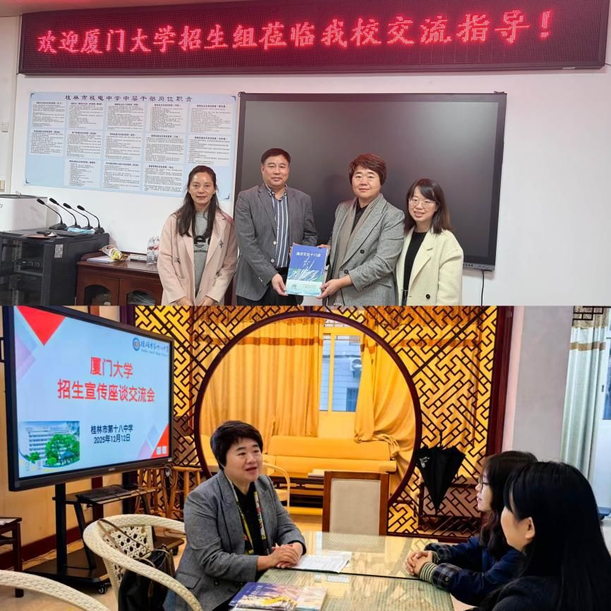 为进一步提高学校影响力和美誉度,吸引优质生源,搭建沟通桥梁,12月12日,厦门大学广西招生宣传组组长、海洋与地球学院党委书记刘艳杰与学院党务秘书张露月一行先后赴桂电中学、桂林市第十八中学、广西师范大学附属外国语学校开展招生宣传活动。