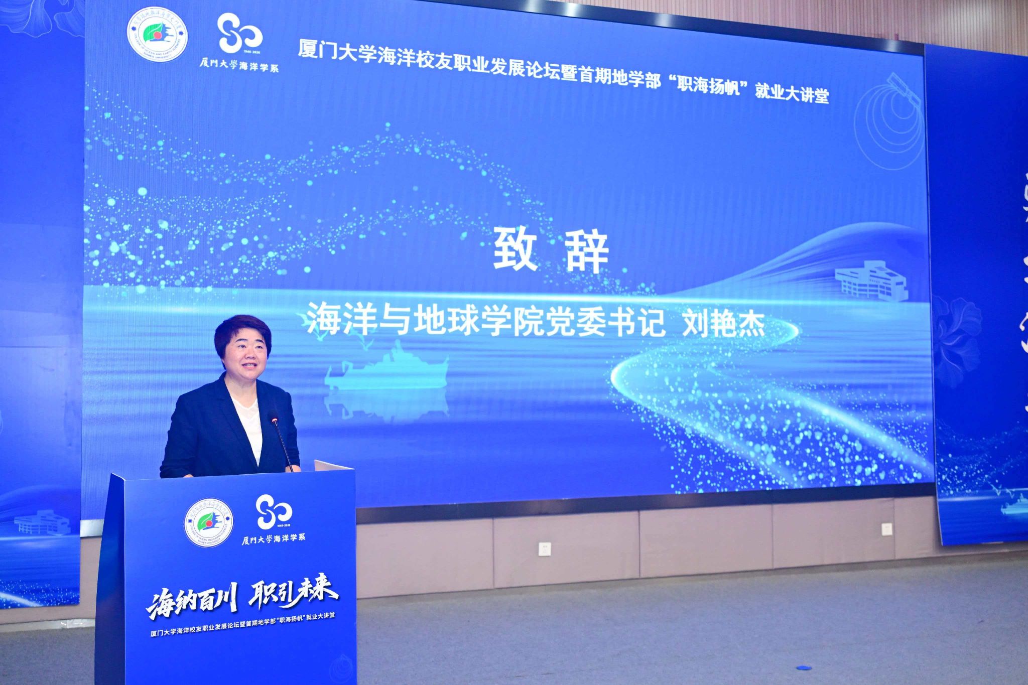 活动伊始,海洋与地球学院党委书记刘艳杰上台致辞。她深情回望厦大海洋学系八十年耕海探洋的光辉历程,强调海洋学科承载着服务国家海洋强国战略的重要使命,寄语青年学子以优秀校友为榜样,将个人成长融入国家发展,在职业道路上脚踏实地、勇毅前行。