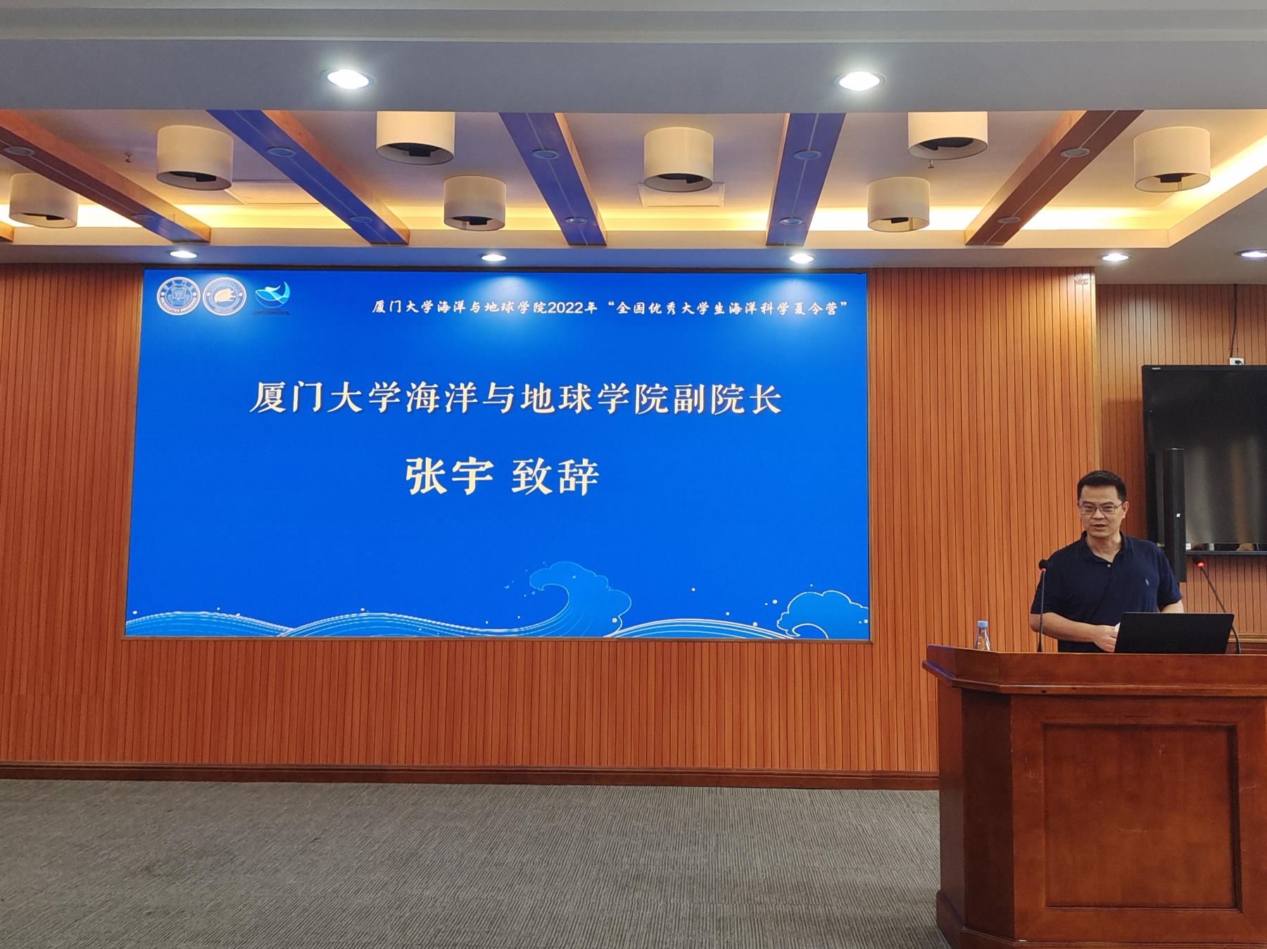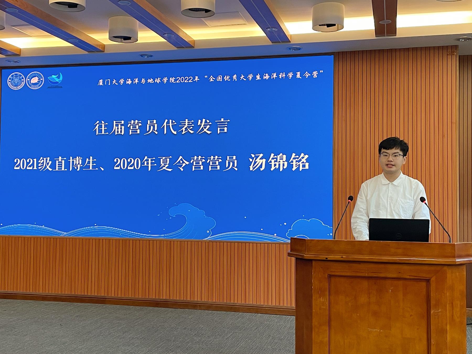 7月13日上午,夏令营开营仪式在希平楼C2-403报告厅举行。学院院长史大林、副院长徐鹏、海洋生物科学与技术系副主任陈仕玺、物理海洋学系教授段安民、团委副书记蔡笑霜、教学秘书邹良荣及全体营员参加。徐鹏副院长从学院总体概况、拔尖创新人才培养、一流平台与支撑体系、开放交流合作、高水平科学研究及高素质师资队伍等方面,自豪详尽地为营员们介绍学院情况。2021级直博生汤锦铭作为往届营员代表,分享了他的学习生活体验。成为厦大海洋学子的五年时间里,让他感受最深的是学院包容的环境和老师们无私的帮助,这让他坚定投身科研的信心。他邀请学弟学妹们加入学院,为“蓝色星球”贡献力量。