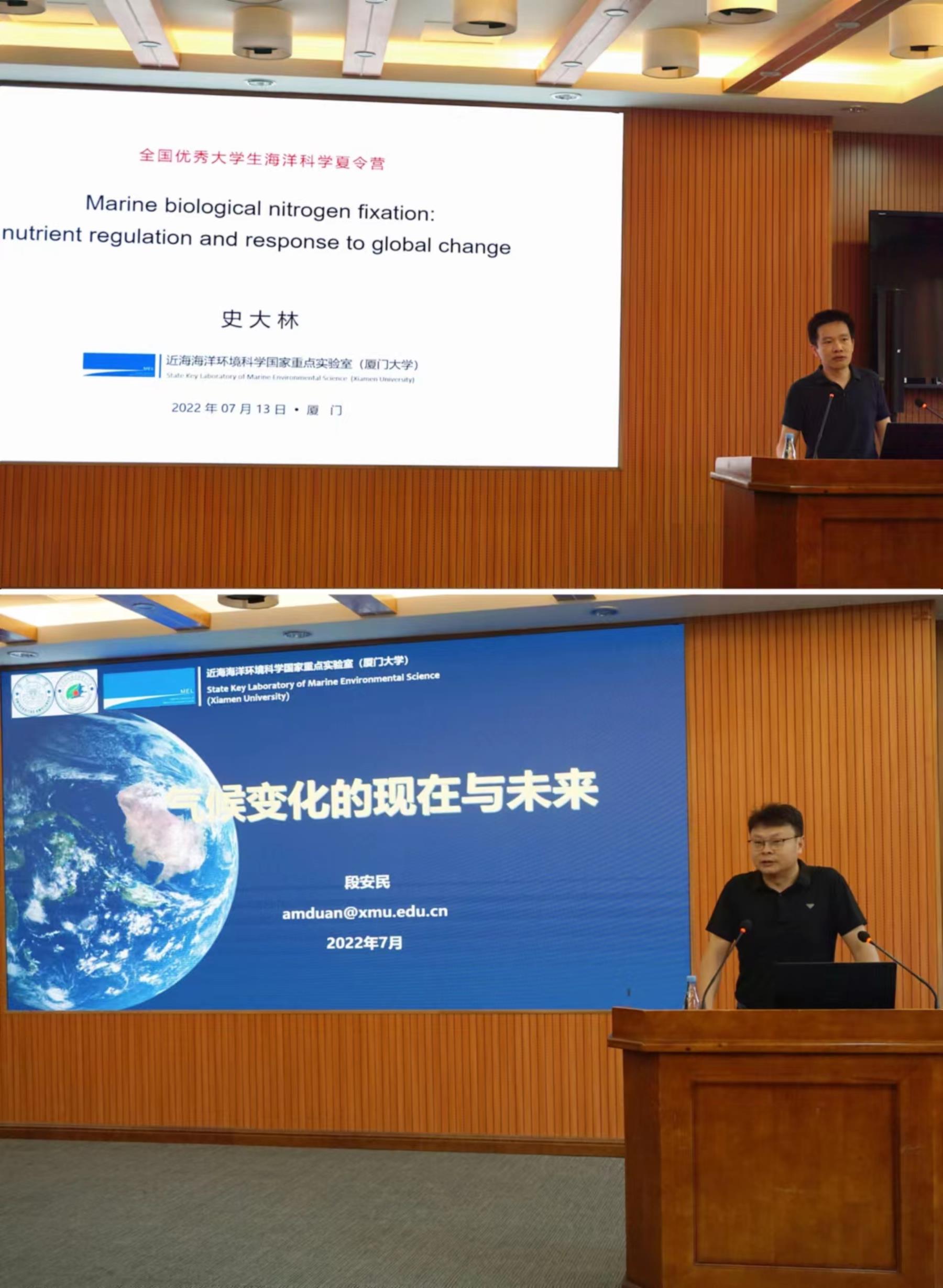 开营仪式后,两场学术讲座顺利开展。史大林院长带来《Marine biological nitrogen fixation: nutrient regulation and response to global change》讲座。不同海域的重要固氮生物与限制因子不同,但还有很多海域的生物固氮的时空分布与调控因子是未知的。他详细介绍了生物固氮的过程与重要性,介绍了相关研究方法及他所在团队的研究成果,号召同学们去探索生物固氮作用更深层的机理。段安民老师带来《气候变化及未来预估》讲座。他强调,当下全球气候变化是世界各国都关注的重大问题,对全球气候变化研究的重要性不言而喻。人类活动影响了气候变化,对气候影响因素进行系统模型构建,对不同CO2排放情景下全球升温情况进行预估,是我们需要关注的课题。