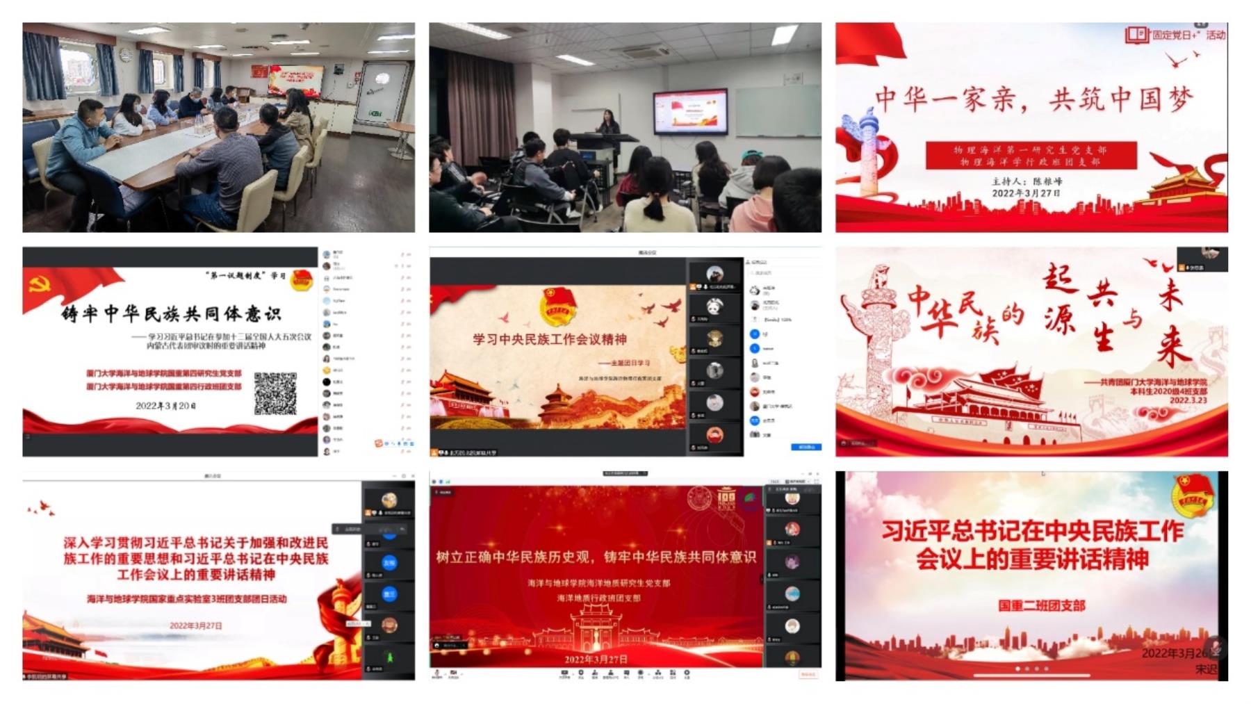 各党支部、团支部在遵守防疫相关规定的前提下,以“固定党日+”、主题团日的形式,积极开展线上线下学习活动,师生党员、团员联系生活实际广泛开展讨论,纷纷表示要自觉将思想和行动统一到习近平总书记重要讲话精神上来,牢固树立休戚与共、荣辱与共、生死与共、命运与共的共同体理念,切实维护国家统一和民族团结,为实现中华民族伟大复兴的中国梦而不懈奋斗。