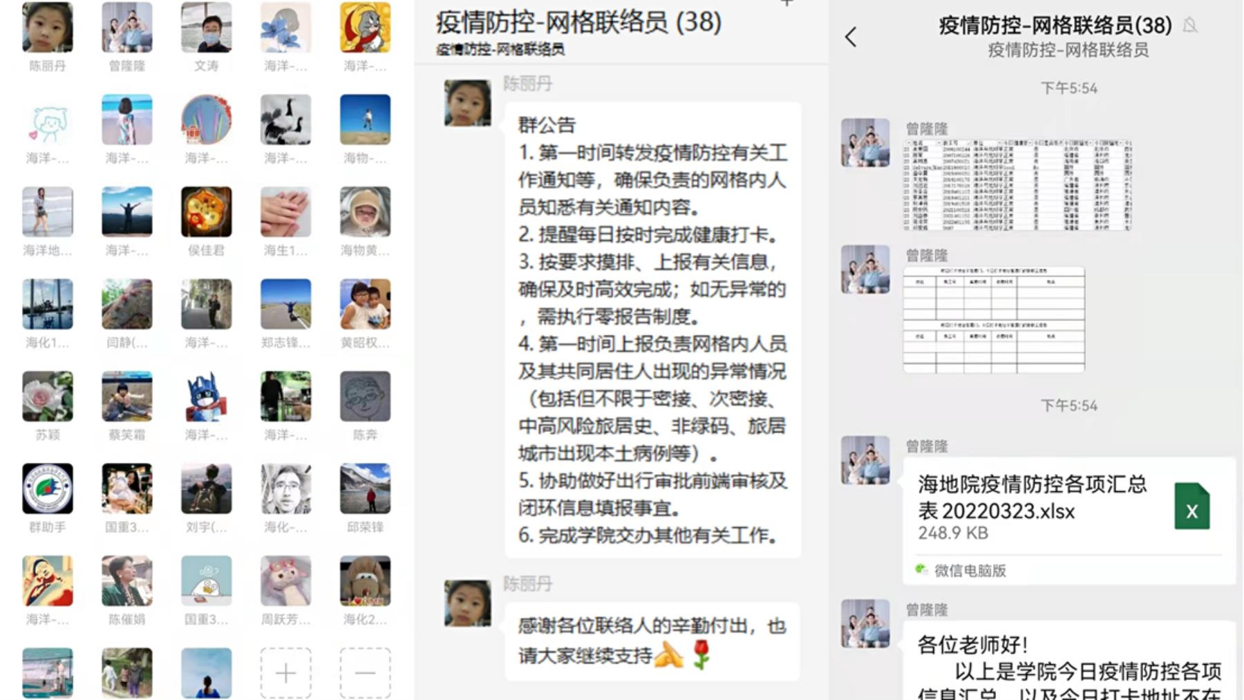 自2020年新冠肺炎疫情暴发以来,有一群“幕后英雄”一直默默助力学院疫情防控工作。两年多来,疫情防控联络员、网格员们始终紧绷疫情防控这根弦,事无巨细、不折不扣落实疫情防控要求,及时高效做到上传下达和信息的精准摸排、汇总,做好疫情防控网格化管理的“传动轴”,当好信息排查员和政策宣传员,以高度的责任心和使命感织密疫情“防护网”,守好学院“责任田”。面对突发疫情,学院学工组成员们积极应对、迅速集结,第一时间走访了实验室和学生宿舍,开展防疫政策宣传,提醒学生做好防护,同时开启“24小时在线”工作模式,随时关注学生思想动态,掌握学生健康状况,关心学生心理状态。