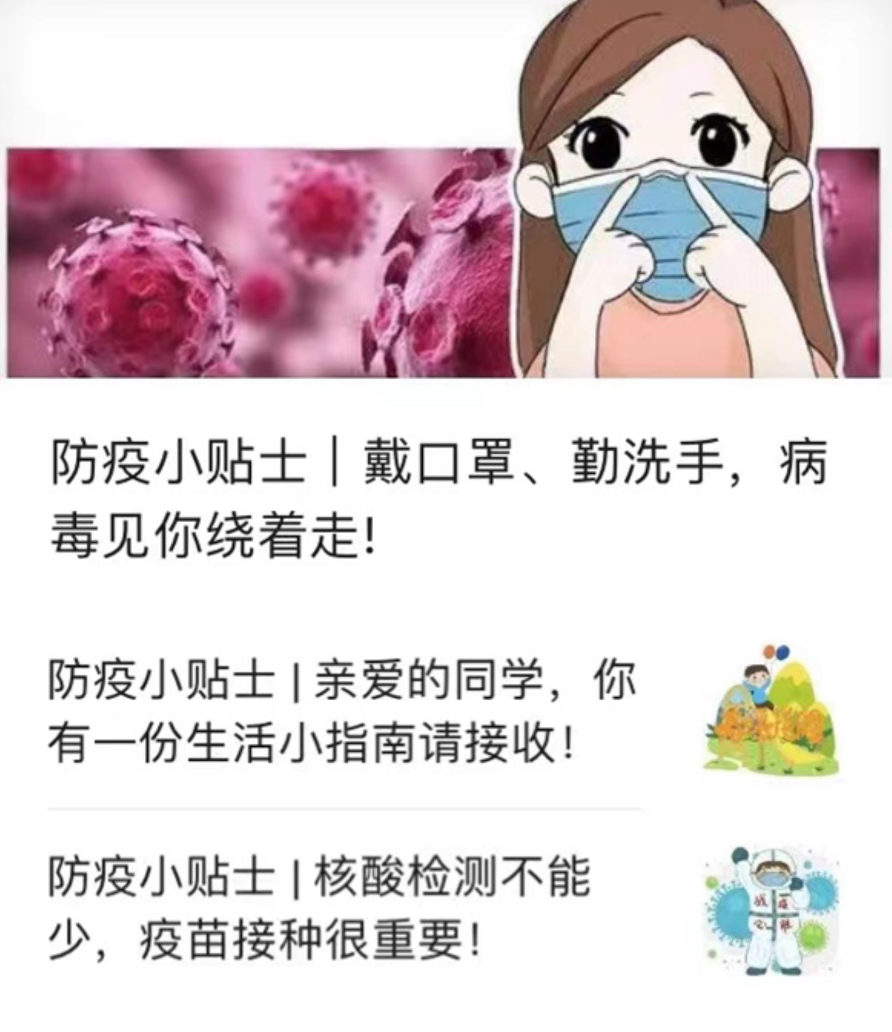 此外,学院充分利用官方宣传平台,在学院网站主页、学院微信公众号上大力宣传疫情防控政策要求,科普疫情防控知识,提供疫情期间生活指南。在学院电子显示屏滚动宣传防疫提醒,在“湛蓝风华”公众号推出系列推文“防疫小贴士”,帮助师生提高防范意识,引导师生科学做好防护,服务保障学生生活需求。