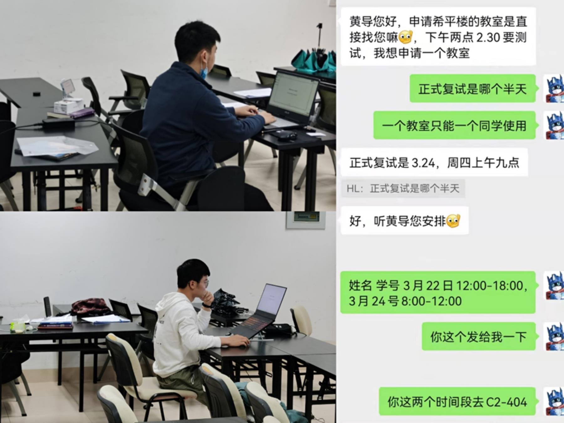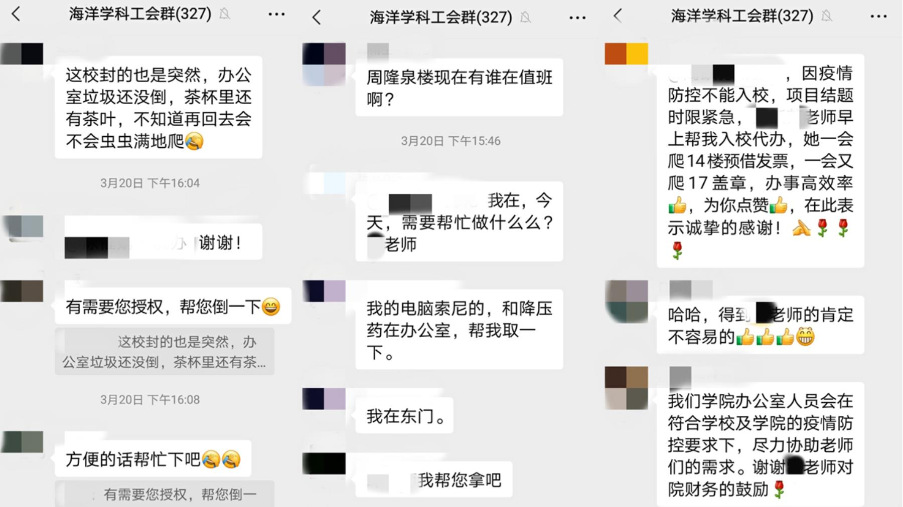 校园封闭式管理期间,疫情防控工作人员坚守岗位,除了做好防控工作,还及时回应师生诉求,提供细致周到的服务。办公室茶渣未清理,老师授权,他们帮忙处理;电脑放在实验室,他们充当“快递员”送到师生手里;文件需要盖章,他们跑腿帮师生妥善办理。各大高校研究生复试通知陆续发布,受疫情影响大多数院校选择线上复试的形式,为帮助考研学生积极应对“云复试”,在保证疫情防控要求和考试公平公正的前提下,海洋与地球学院为参加考研复试的学生提供了单独的“云复试空间”,解考研学子的“云复试”之急。