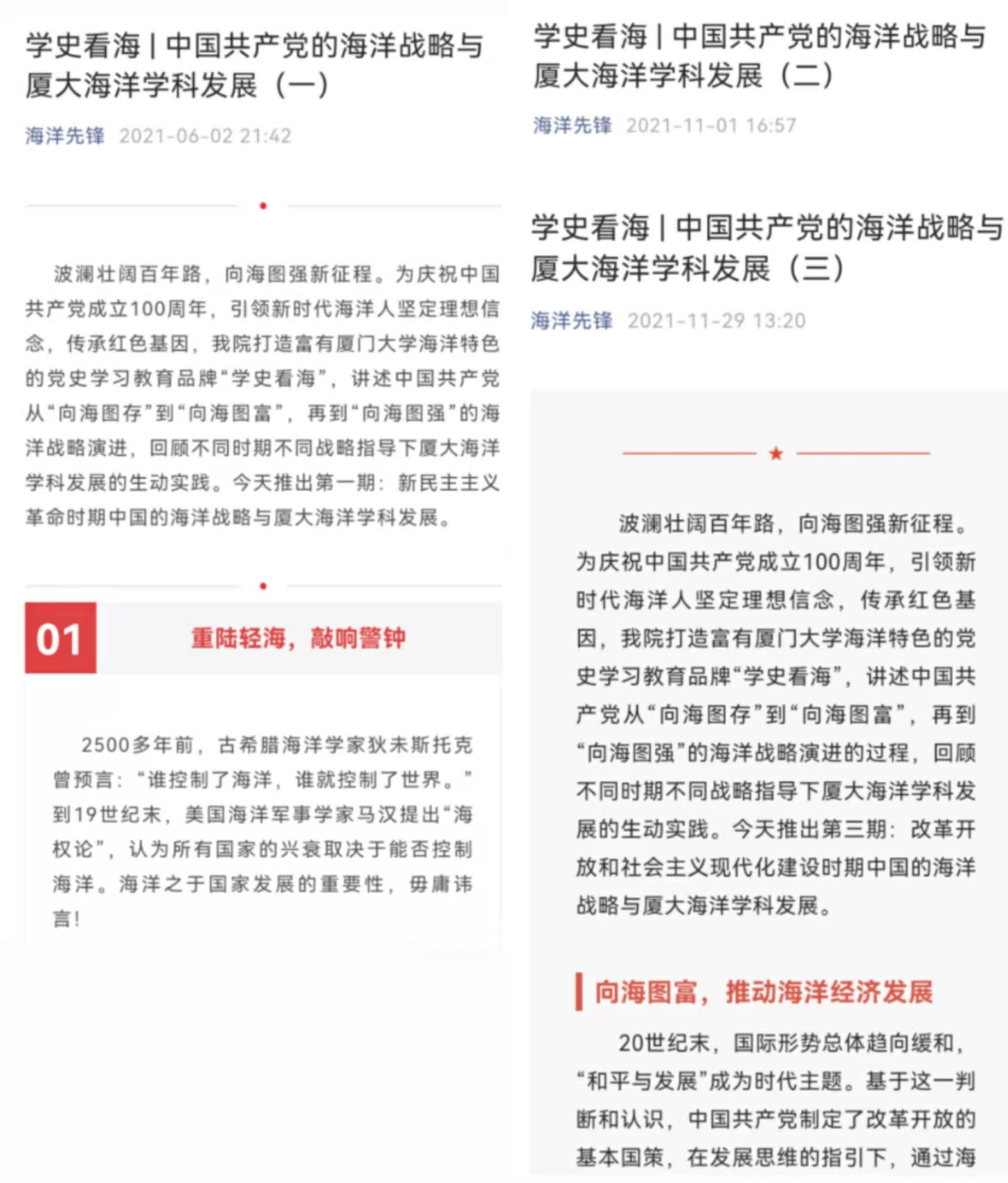 “学史看海”主题推文发挥厦门大学因海而生、伴海而长的校史、近百年厦大海洋学科发展史、海洋与地球学院院系史等体系发展优势,提炼中国共产党自成立以来对海洋的认识,归纳总结厦大海洋学科伴随中国共产党发展的经验方法和鲜活实践案例,并进行理论提升,打造了富有厦大海洋特色的党史学习教育品牌。通过回顾中国共产党在四个时期的海洋战略以及厦大海洋学科发展的历史,感悟思想伟力,为开启新百年的征程凝聚奋进力量。