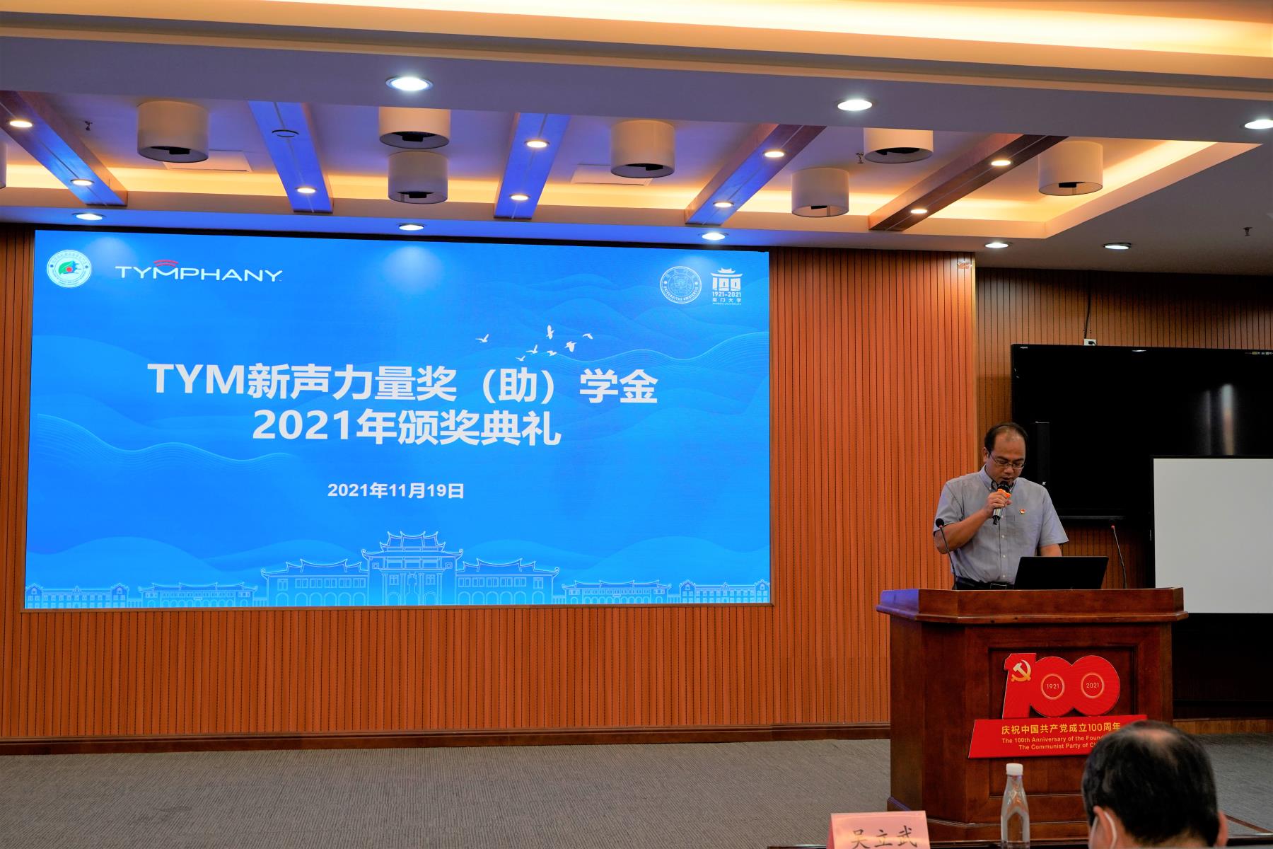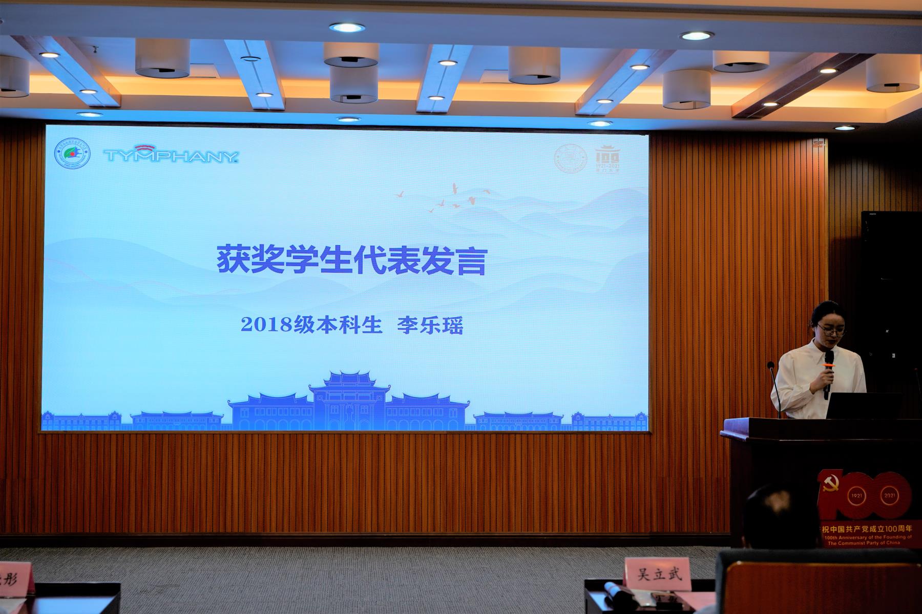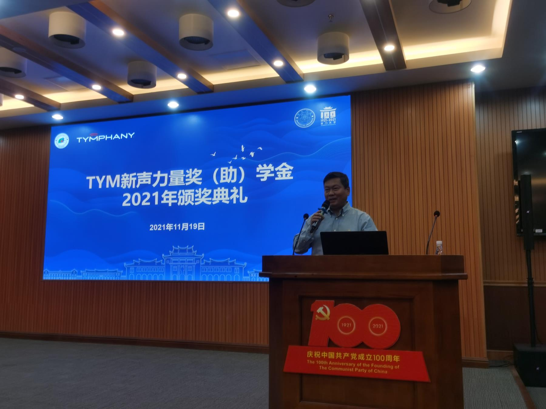 颁奖仪式上,刘晓彤总经理和吴立武书记共同为获得2021年TYM新声力量奖(助)学金的10名同学颁发获奖证书。随后,2018级本科生李乐瑶同学作为获奖学生代表发言,她向提供资助的惠州迪芬尼声学科技股份有限公司、以及一直关心和帮助同学们的学院老师表示感谢,她向大家汇报了大学三年来在学习和学生工作取得的成绩,号召同学们将这份感恩之心化为学习和科研的不竭动力,将个人的理想融入到国家和民族的伟大梦想之中,勤勉笃行、奋发向上。