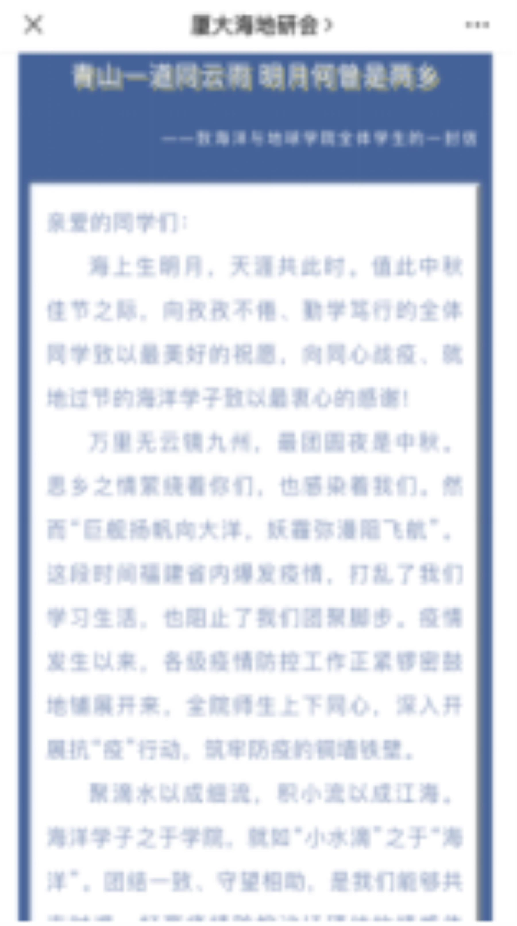问候暖人心,祝福递深情。疫情阻挡了出行的脚步,却阻挡不了爱的传递。中秋佳节,学院党委书记吴立武,学院党委副书记邱荣锋、唐腾凤,团委副书记侯佳君,辅导员黄良、陈雅琪、刘宇等走访慰问学生,解读防疫政策的同时关怀学生身心健康。学院发出《致海洋与地球学院全体学生的一封信》,送上节日的问候和美好的祝愿,还为学生们精心准备月饼、口罩和抑菌洗手液等暖心的“中秋大礼包”。