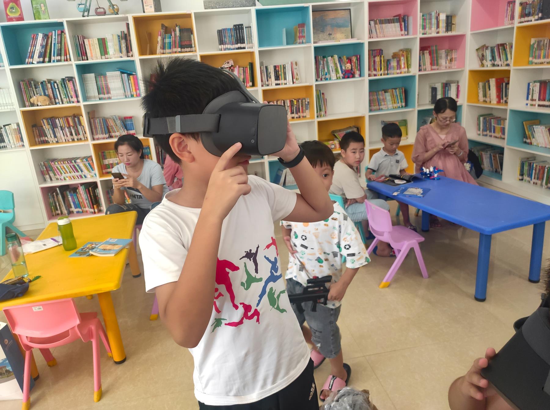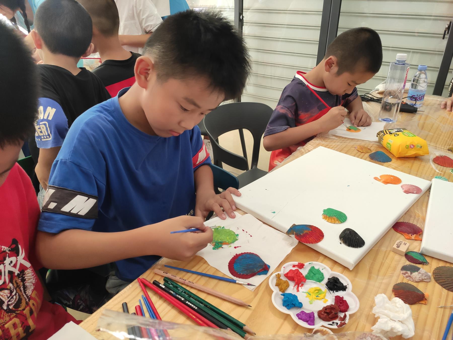 除了讲座外,小朋友们还在志愿者的协助下进行了贝壳画的设计比赛、佩戴VR眼镜感受海洋世界。在贝壳画的制作中,小朋友们团结协作,用彩色颜料和贝壳描绘了想象中的“星空和星球”“北极极光”“海底世界”以及漂亮的花朵。