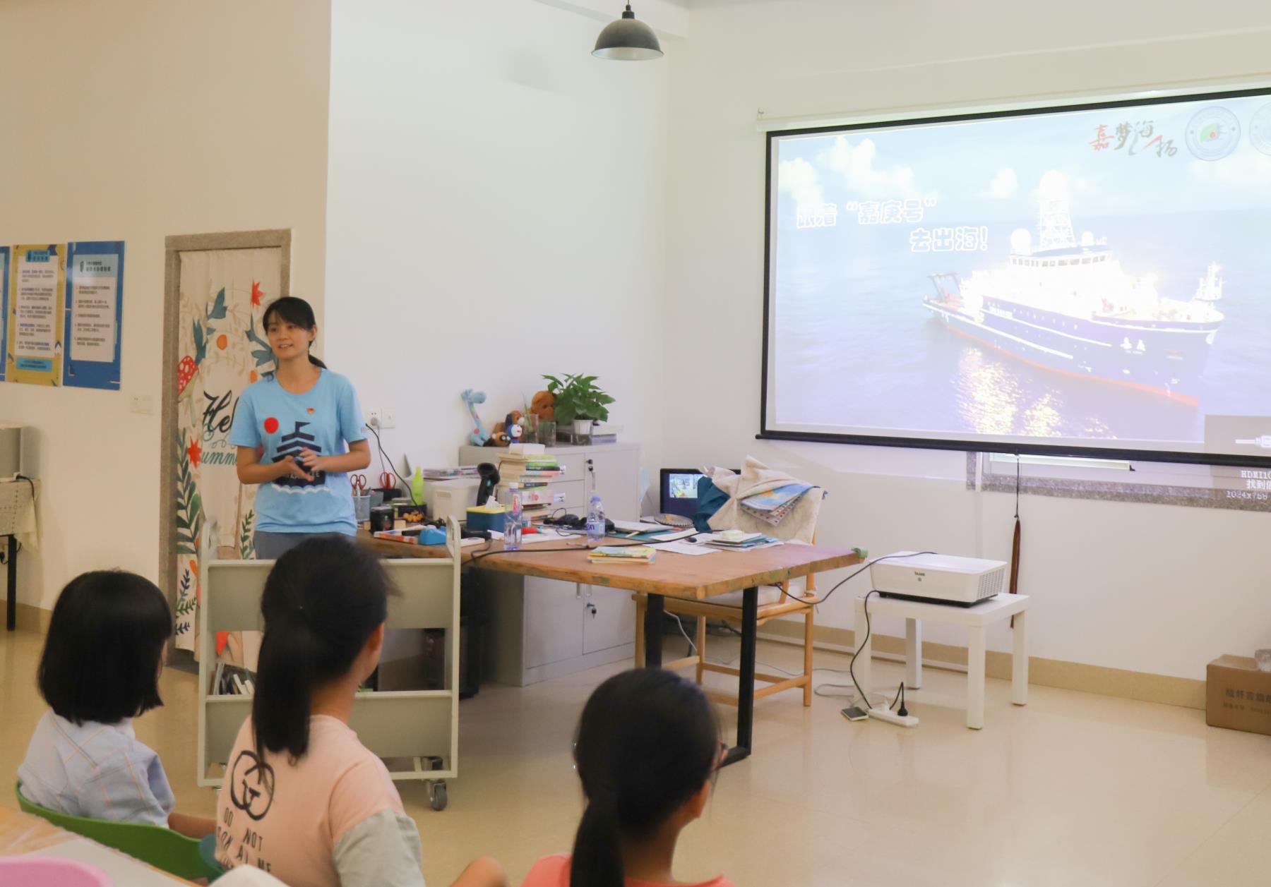 服务团成员康佩虹以“跟着‘嘉庚’号去出海”为主题带来了一场有关海洋科考的讲座。讲座上,小朋友们通过观看一张张照片、一段段视频“云参观”了厦门大学“嘉庚”号科考船,去感受海洋的辽阔和变幻莫测,同时还了解了海洋科学家的工作。