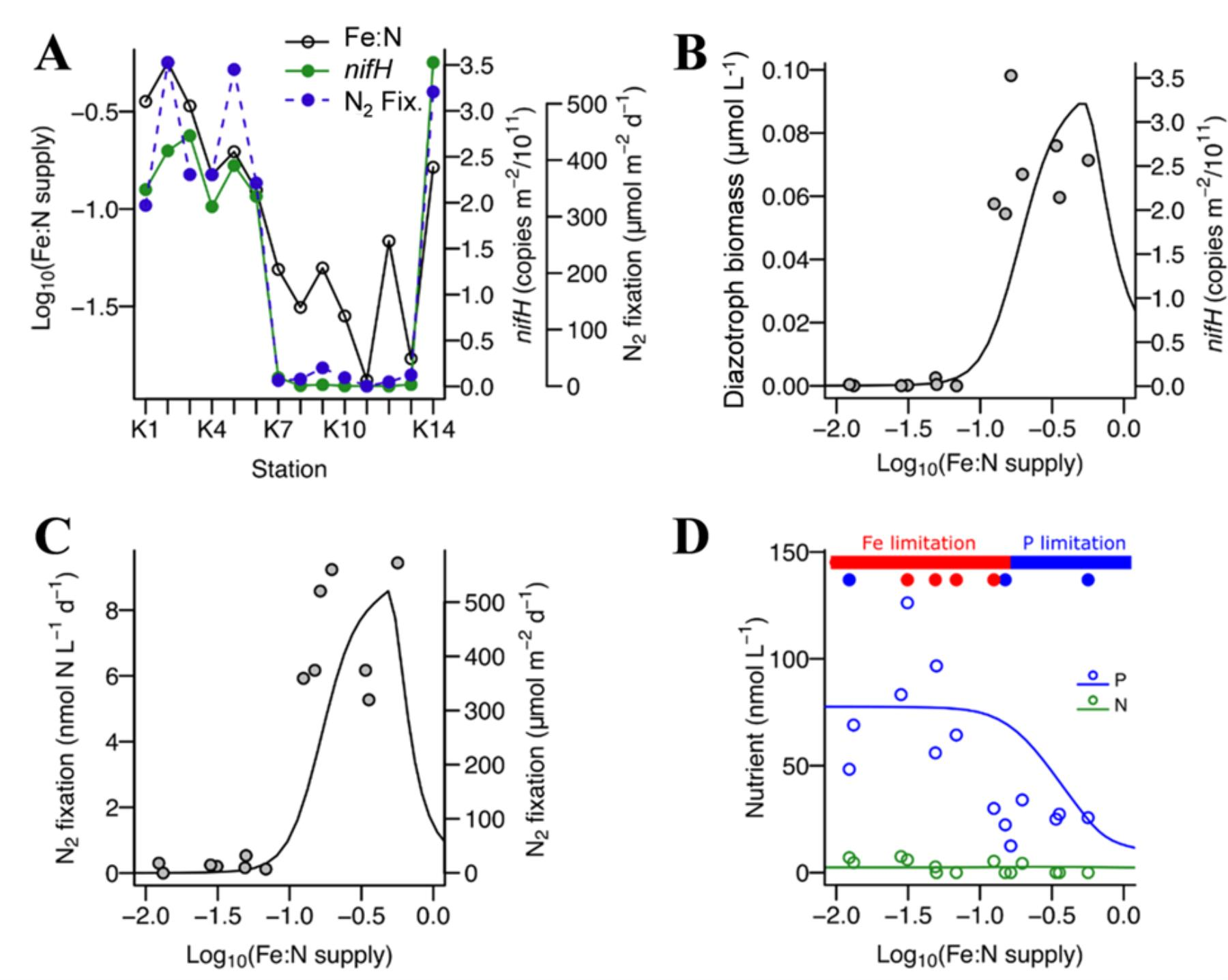 图3. Fe:N供给比率对固氮速率和固氮生物丰度的调控作用。(A)Fe:N供给比例与固氮速率和固氮生物丰度的相关性;(B)和(C)资源竞争模型输出结果与观测的吻合;(D)模型输出的营养盐限制与现场试验结果吻合。