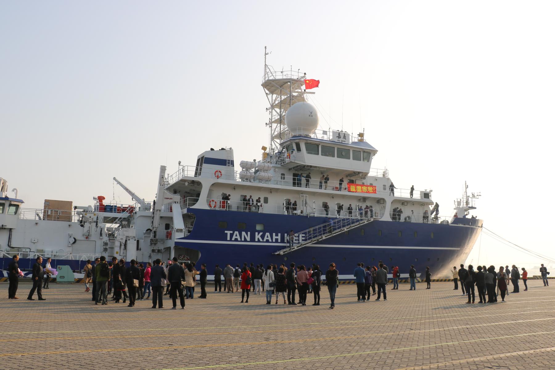 2015年3月31日,科考船在广州广船国际有限公司芳村厂区新区码头正式开工建造,去年5月8日,“嘉庚”号科考船举行下水暨命名仪式。作为一艘世界顶级海洋综合考察船,“嘉庚”号创造了许多“第一”:全球第一艘在升降鳍上设置走航超洁净海水采集系统的科考船,升降鳍可自由在水下收放、伸缩,鳍上装备有多波束装置等高性能声学设备系统,海底的环境生态能看得一清二楚;我国第一艘采用国外方案设计、国内转化详细设计,由高等学校拥有完全知识产权的海洋科学综合考察船;我国第一艘具备洁净采样、操作、分析能力的科考船,能够支持水文、化学、生物、地质地球物理、大气和相关交叉学科的实时、同步观测和现场科学实验研究,支持信息数据远程传输;我国第一艘全电力静音推进科学考察船,可在全球所有无冰洋区航行,两次加油可绕地球赤道一圈;我国第一艘通过挪威船级社船舶噪声船级符号Silent A+S指标的船舶,船舶驶过水面时,噪音水平仅与会议室开会所产生的噪音水平相对当;我国第一艘在全球科考工作空间(包括甲板和实验室)布置与国际通行标准接轨的科考船工作甲板系固体系的船舶,科考设备可自由安装在甲板和实验室地板上。