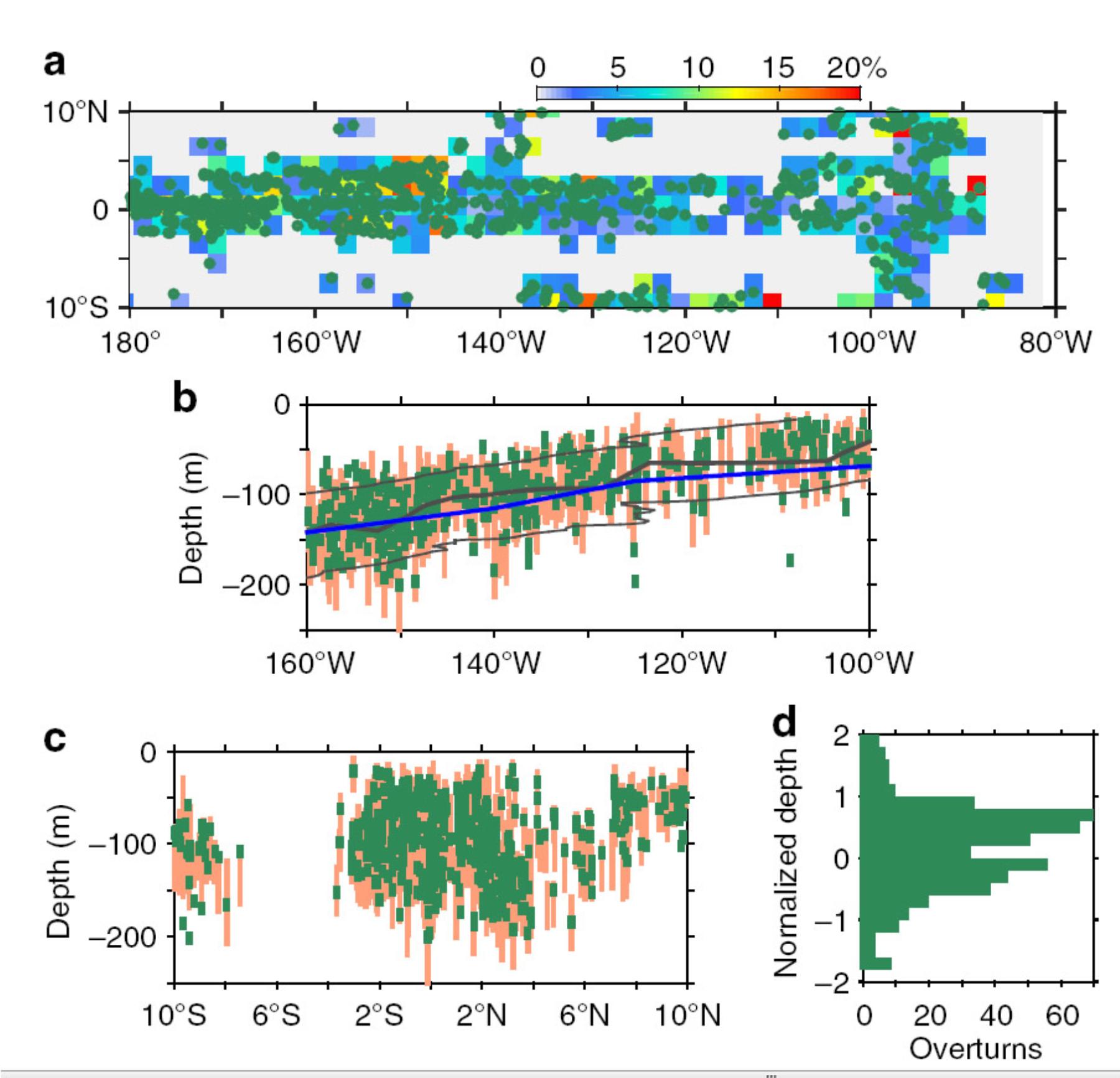Figure 3. | Spatial distribution of detected density overturns in the equatorial Pacific cold tongue. (a) Occurrence probability (colour) and horizontal locations of overturns (dark green dots). (b) Depth and sizes (in metres) of the overturns (dark green bars) occurred between 3°S and 6°N, and the corresponding PLs (light orange bars) from a latitudinal view. The blue curve denotes the mean depth of the EUC core (averaged over ±1°; data are obtained over the 1990s (ref. 70)). The thick black curve and thin black curves denote the centre (depth of maximum N2;N2max) and bounds (depths of half N2 max) of the mean pycnocline. N2 is calculated from sample mean density that is meridionally averaged from all fine-resolution Argo profiles over ±1°. (c) The same as in b but assembled from data between 160 and 100°W(curves of average variables are not added due to large zonal variation). (d) Histogram of overturns at the referenced and normalized vertical coordinate.