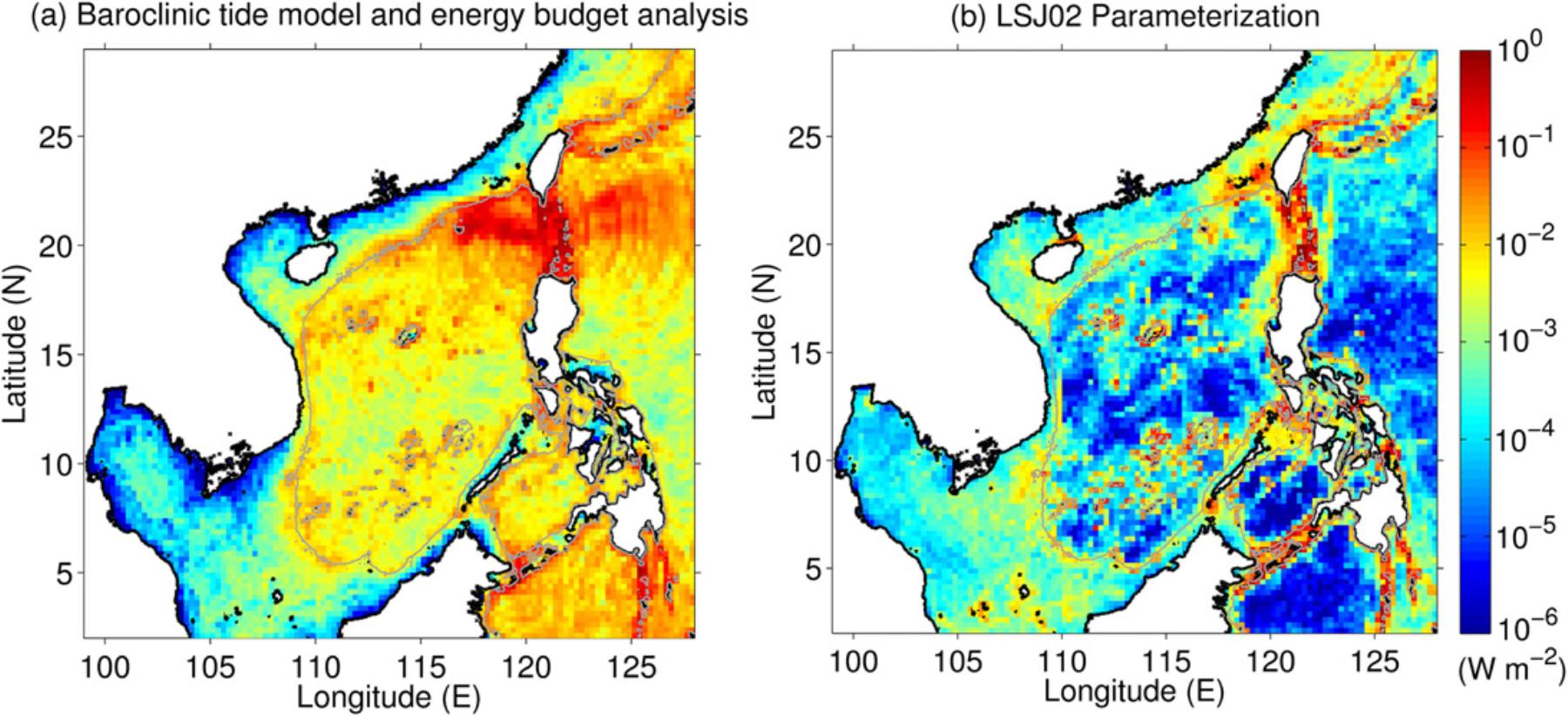 Figure 2. Annual-mean depth-integrated dissipation rate of baroclinic energy estimated by (a) the baroclinic tide model and energy budget analysis as well as (b) the LSJ02 parameterization. The gray contours represent the 200-m isobath.