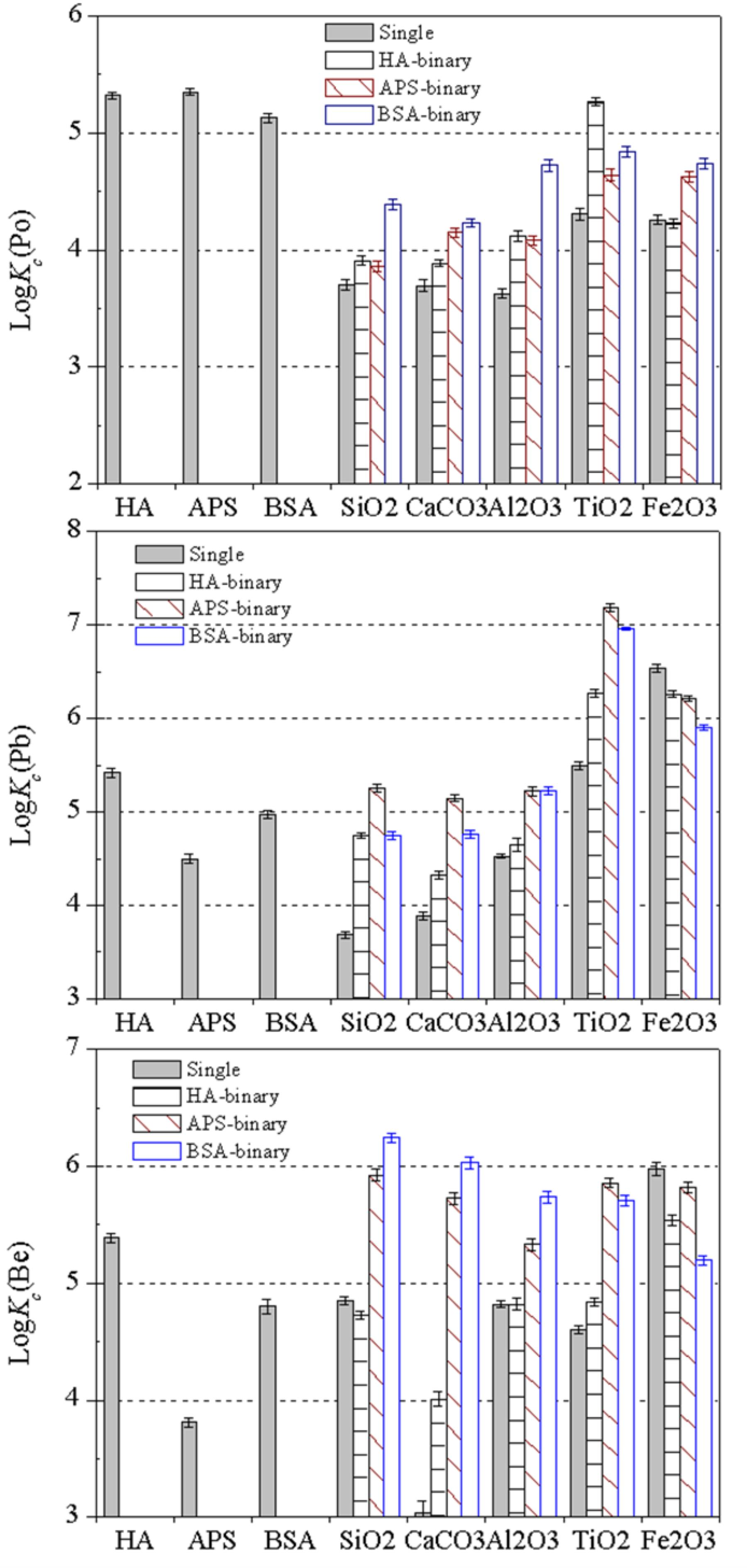 Improved applications of 210Po, 210Pb and 7Be as geochemical proxies require more detailed understanding of their interactions with particles. Here, laboratory sorption experiments were carried out to examine the adsorption of 210Po, 210Pb and 7Be and their fractionation on inorganic nanoparticles, including SiO2, CaCO3, Al2O3, TiO2 and Fe2O3, in the presence or absence of macromolecular organic compounds (MOCs) that include humic acids (HA), acid polysaccharides (APS) and proteins (BSA), in natural seawater. Results showed that nanoparticle sorption was not greatly enhanced over that of microparticles as would be expected from their much higher specific surface areas, likely indicating their aggregation in seawater. It was found that synergistic interactions between inorganic nanoparticles, MOCs, and radionuclides determined the sorption, although their adsorption was particle composition-dependent. MOCs enhanced the sorption of selected nuclides on most nanoparticles. On average, in the presence of MOCs, partition coefficients (Kc) of 210Po, 210Pb, and 7Be on nanoparticles increased 2.9-, 5.0- and 5.9-fold, respectively. The effect of MOCs could be explained for 210Po and 210Pb from their different log Kc values on inorganic nanoparticles. In addition, fractionation effects between 210Po and 210Pb (or between 210Pb and 7Be) could be quantified from their relative log Kc values on end-member sorbent components. Applications of both 210Po–210Pb and 7Be–210Pb pairs as particle dynamics tracers could be more quantitative when the nature of the organic coatings is taken into account.