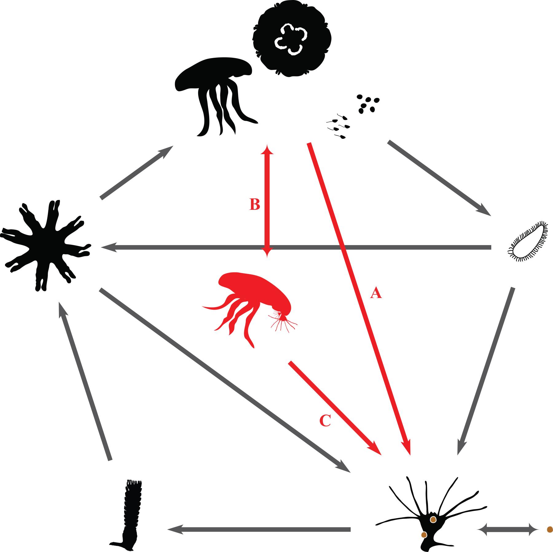 海月水母(Aurelia spp.)是刺胞动物门(Cnidaria)钵水母纲(Scyphozoa)旗口水母目(Semaeostomeae)洋须水母科(Ulmaridae)的代表种类,广泛分布于北纬70°至南纬40°的世界海域。海月水母生活史有典型的世代交替现象,包括营固着生活的无性水螅体世代和营浮游生活的有性水母体世代。传统研究认为,海月水母雌雄异体,精子和卵细胞结合后发育为浮浪幼虫,附着后发育为水螅体;水螅体可行无性繁殖而扩大种群,并在环境适宜时经横裂释放碟状体,后者则发育为水母体。有研究报道,同样营世代交替生活史的两种水螅水母,多赫灯塔水母(Turritopsis dohrnii)和波状感棒水母(Laodicea undulata)可由水母体直接形成水螅体,而不需有性生殖过程的参与,形成生活史逆转现象,引起学界轰动。虽然曾发现钵水母存在由碟状体直接形成水螅体的逆转现象,由于未发现在成体阶段完成而被认为不具备完全的生活史逆转潜力,甚至有学者认为该潜力在钵水母种类中明显不及水螅水母。