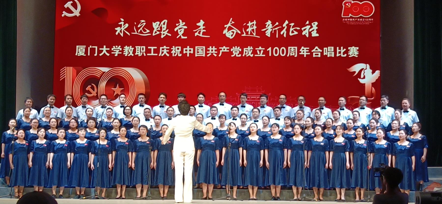 厦门大学“永远跟党走 奋进新征程”教职工庆祝建党100周年合唱比赛于6月26日-27日晚在建南大会堂隆重举行。全校37支教工合唱队共同唱响爱党爱国主旋律,讴歌、颂扬中国共产党百年来的光辉历程和伟大成就。海洋与地球学院合唱队最终以饱满的精神和出色的演唱荣获优秀奖。