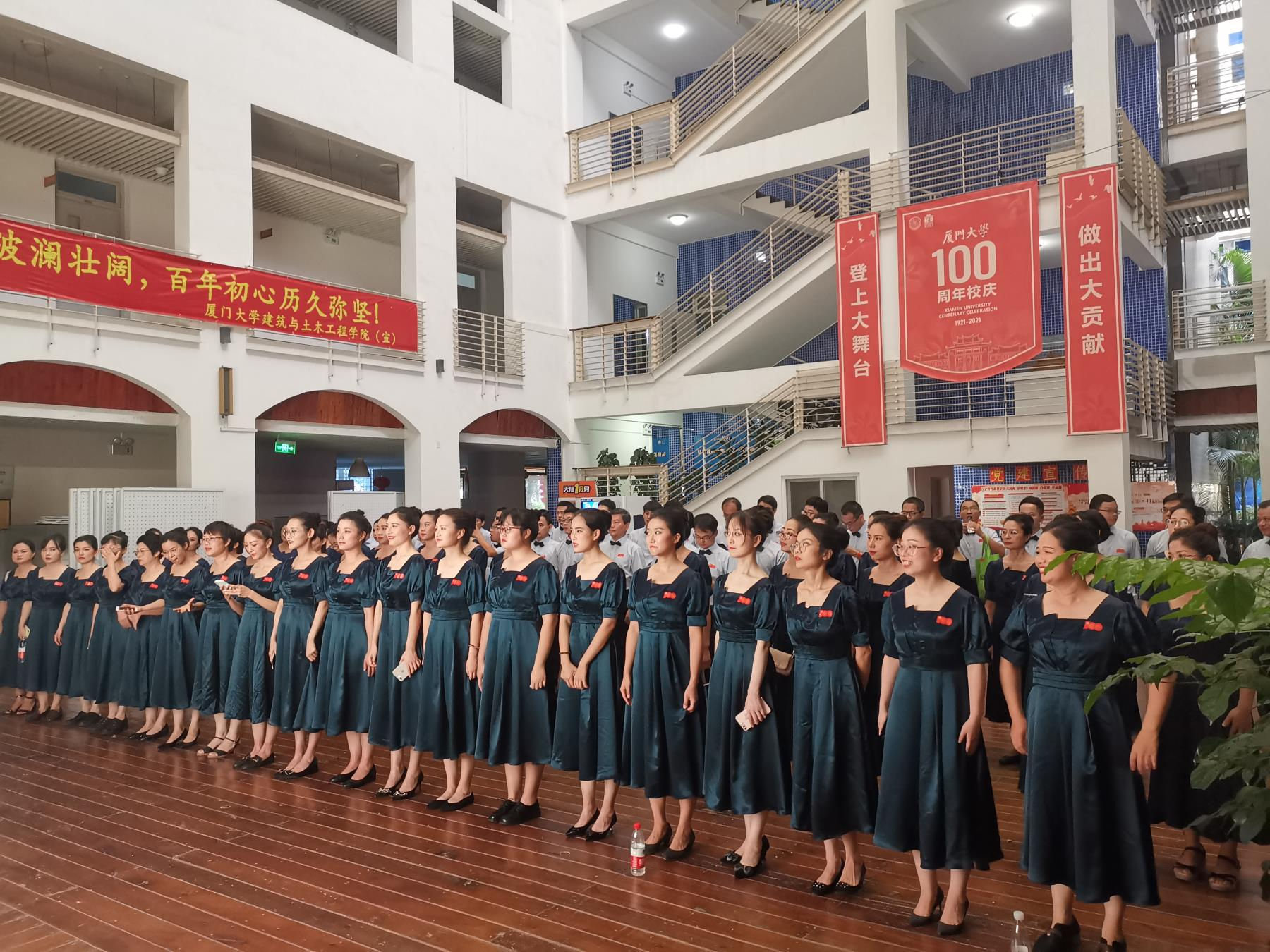 歌声催人奋进,气势振奋人心。本次合唱比赛是厦门大学庆祝建党百年的系列活动之一,学院包括党员在内的83名教职工积极报名参加,张红疆老师担任合唱指挥。在一个多月的筹备中,学院工会召集人员、组织排练、选购服装、联系场地,全力做好合唱训练的各项后勤服务工作,同时联系邀请艺术学院学生担任“小老师”,为合唱排练提供专业指导。参加合唱的老师们积极配合,在百忙中克服万难,尽力腾出时间参与排练。合唱队在大家的共同努力下,终于于6月27日晚在建南大会堂激情唱响,用饱满的精神、嘹亮的歌声,深情回顾党的光辉历程,热情讴歌党的丰功伟绩。