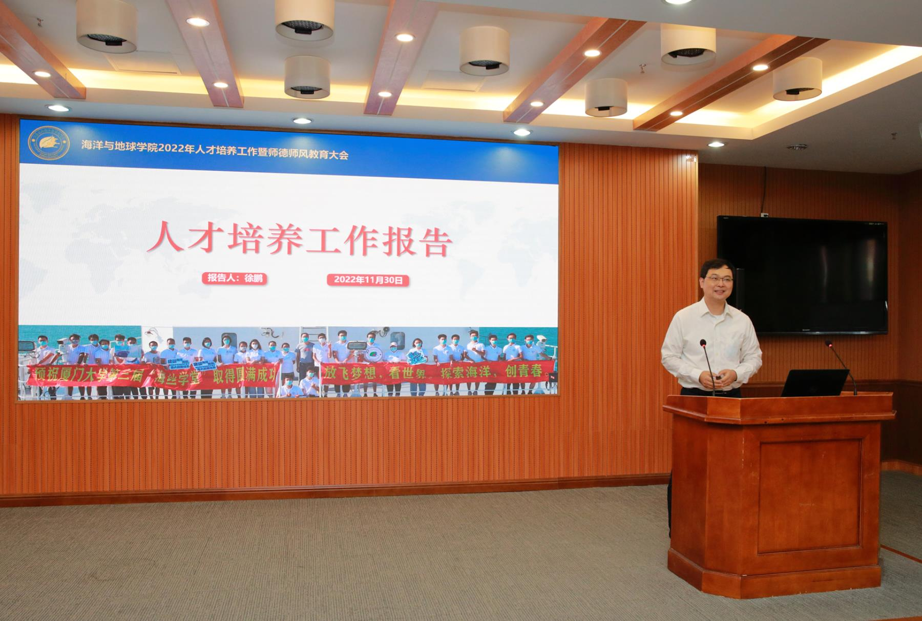 为认真学习宣传贯彻党的二十大精神,落实习近平总书记关于师德师风建设和人才培养工作的重要指示批示精神,推动学院人才培养工作高质量发展,11月30日,海洋与地球学院人才培养工作大会暨师德师风教育大会在希平楼C2-403举行。学院党政班子成员、专任教师、部分专业技术人员、党政人员及辅导员等120余人参加了会议。