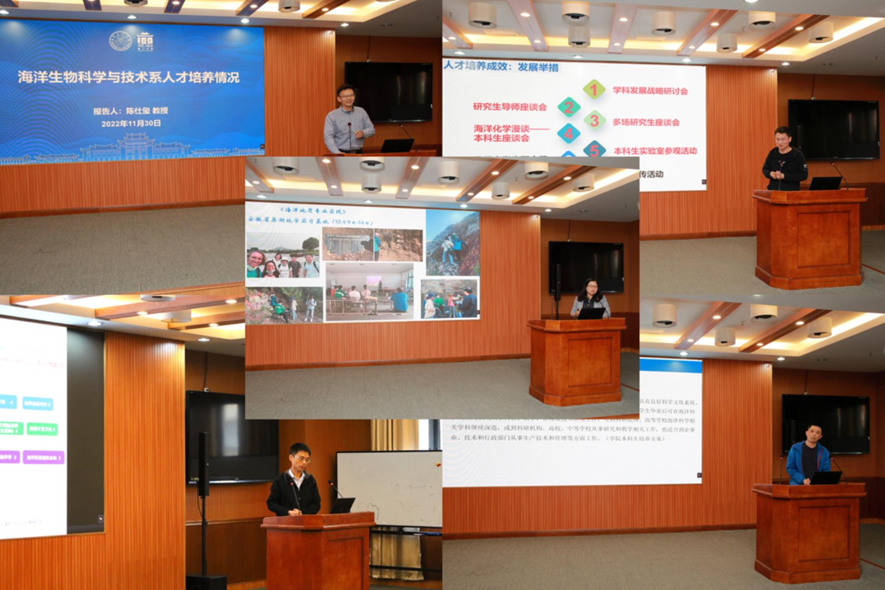 紧接着,海洋生物科学与技术系、海洋化学与地球化学系、物理海洋学系、应用海洋物理与工程系、地质海洋学系等5个系的负责人分别围绕培养理念、培养方案、培养特色和人才培养过程中遇到的问题和存在的不足等作了汇报。