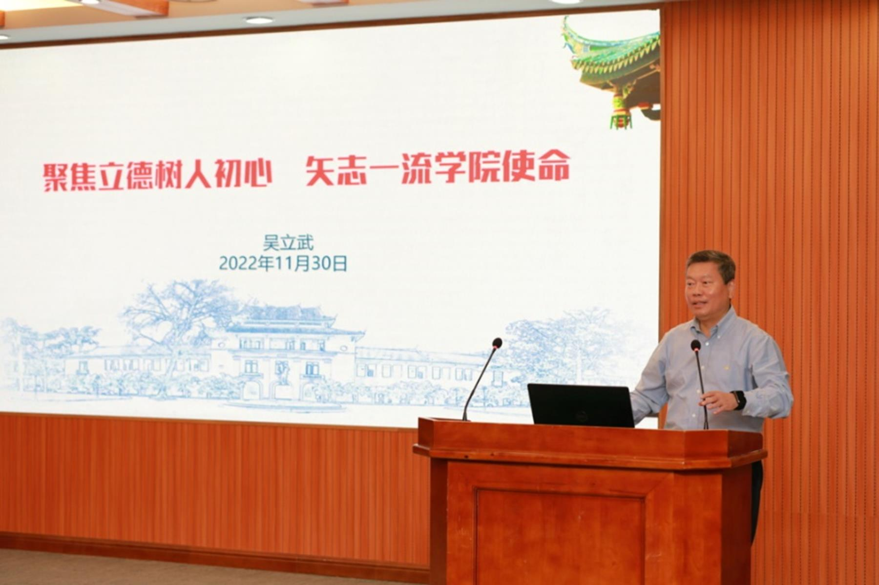 学院党委书记吴立武以“聚焦立德树人初心,矢志一流学院使命”为题作报告,分享了他对人才培养的几点思考。他指出,中国高等教育已经进入高质量发展新阶段,在“两个大局”交织的背景下,厦大海洋应着力提高拔尖创新人才自主培养质量,立足学科优势和专业特色,不断优化学科专业课程体系、教学体系、教材体系、管理体系和思想政治工作体系,为现代化建设提供高质量人才支撑,服务国家战略和社会发展需求,以更高要求践行一流学科的使命与担当。