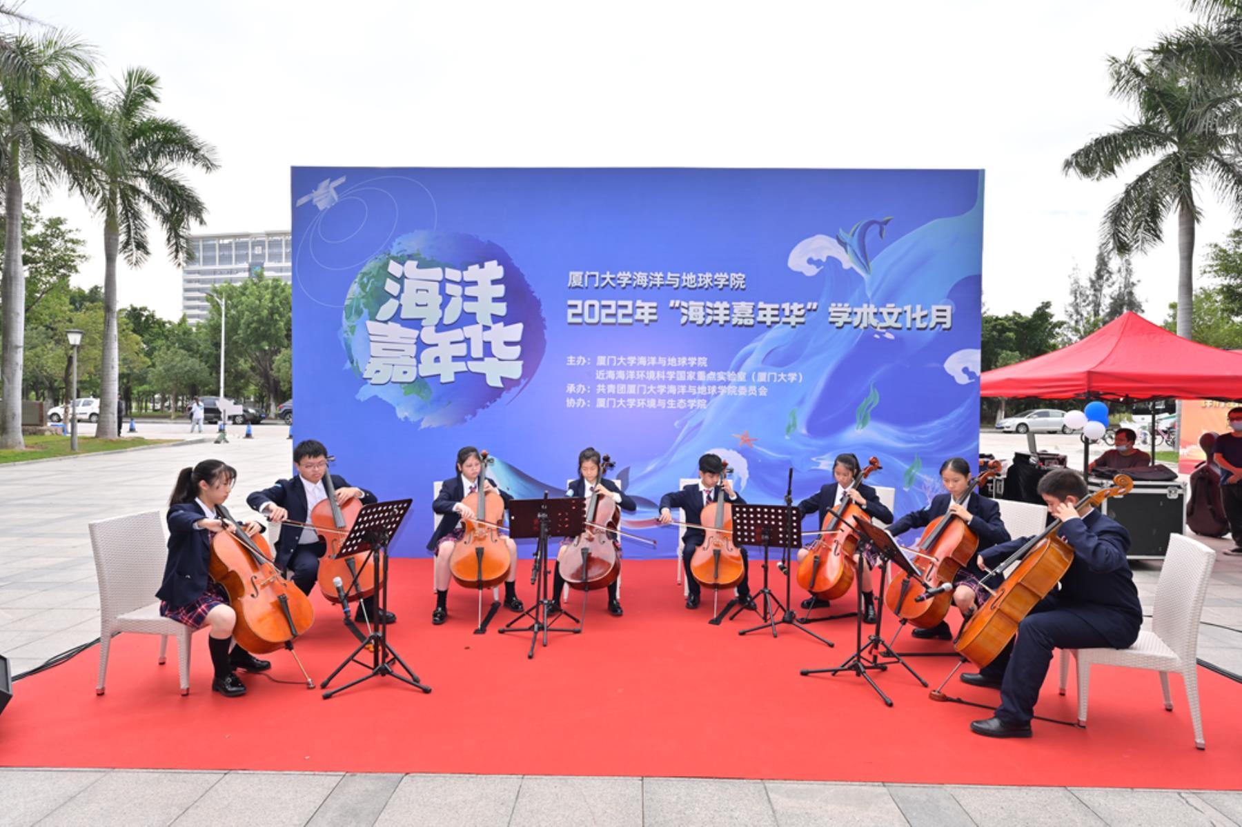 2022年11月27日上午,在厦门市音乐学校大提琴乐团演奏的一曲悠扬的《鼓浪屿之波》中,由厦门大学海洋与地球学院、近海海洋环境科学国家重点实验室主办,环境与生态学院协办的厦门大学2022年“海洋嘉年华”学术文化月活动在翔安校区开幕。