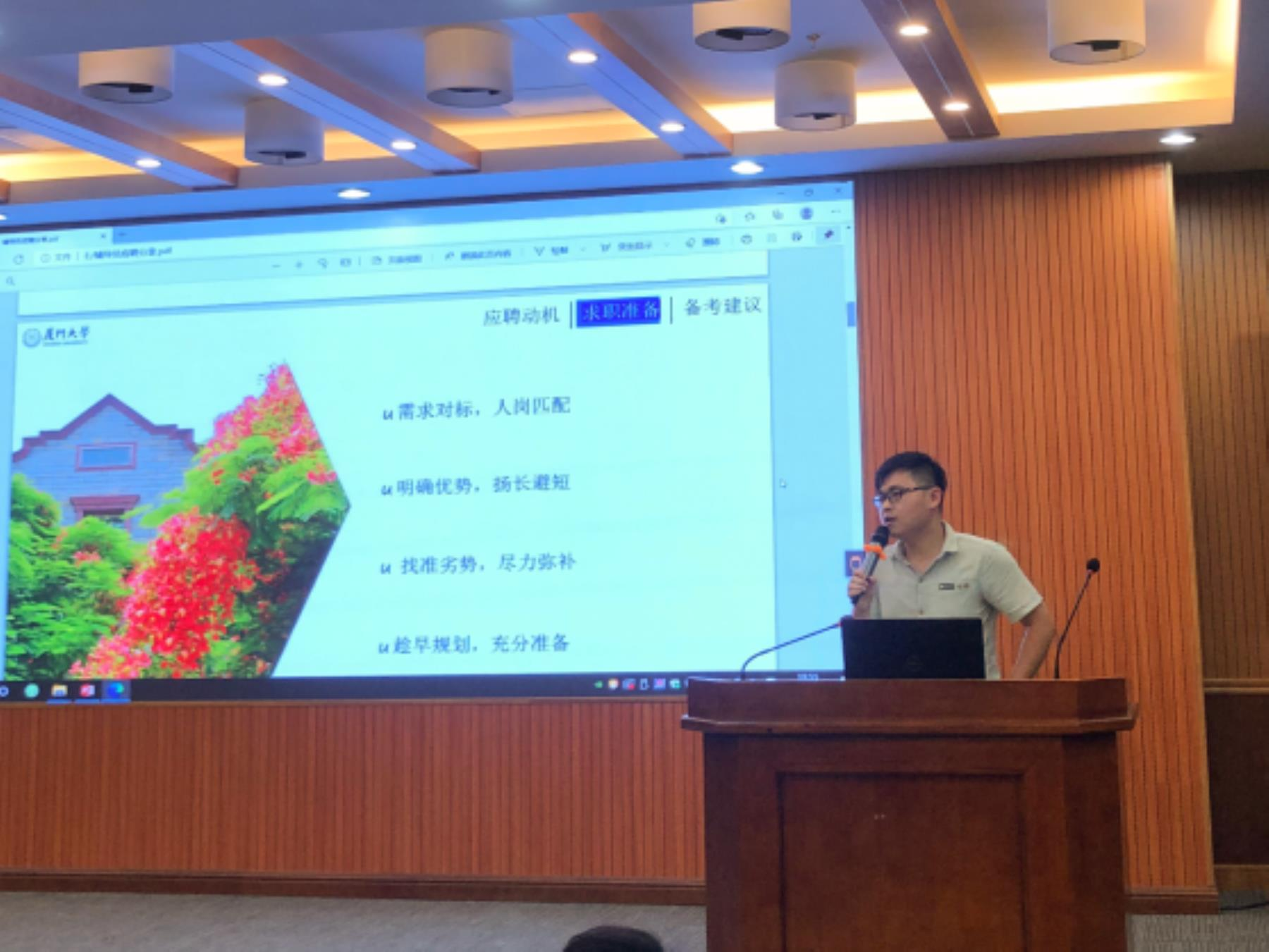5月19日晚,我院于翔安校区希平楼C2-403报告厅举办“家国情怀 启航问海”求职经验分享会——高校招聘专场。本次活动由学院就业创业促进中心承办,邀请医学院辅导员许丽婷、王双生,航空航天学院辅导员刘群,海洋与地球学院辅导员黄良为广大学生分享经验。活动由院团委副书记蔡笑霜主持,来自不同年级的数十名学生参加。