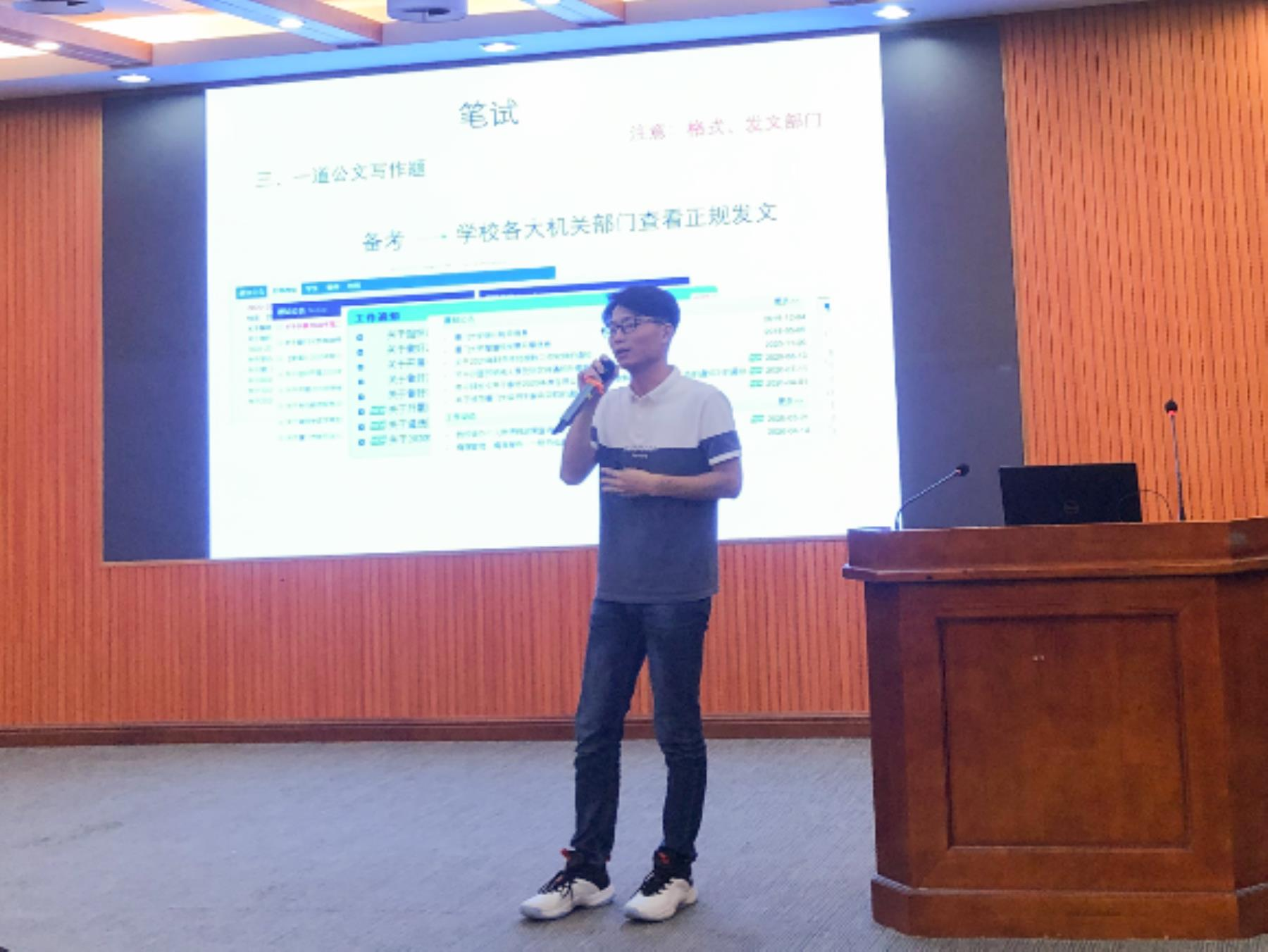 交流会上,许丽婷老师结合求职经验,介绍不同学校的岗位要求、资料查询渠道及报考流程等;王双生老师以具体考试例题指导学生如何做好笔试与面试准备;黄良老师详细讲述了各类高校招聘的报名时间与考试时间,分析不同考试题型,分值分配以及相关面试问题;刘群老师从留校初心、求职经验及备考建议三个方向与同学们分享他的求职经历。
