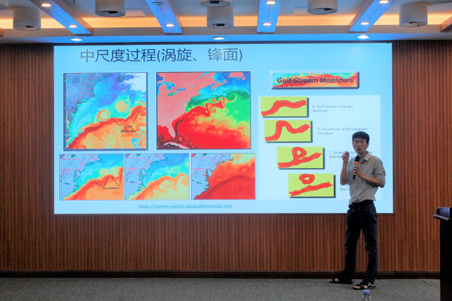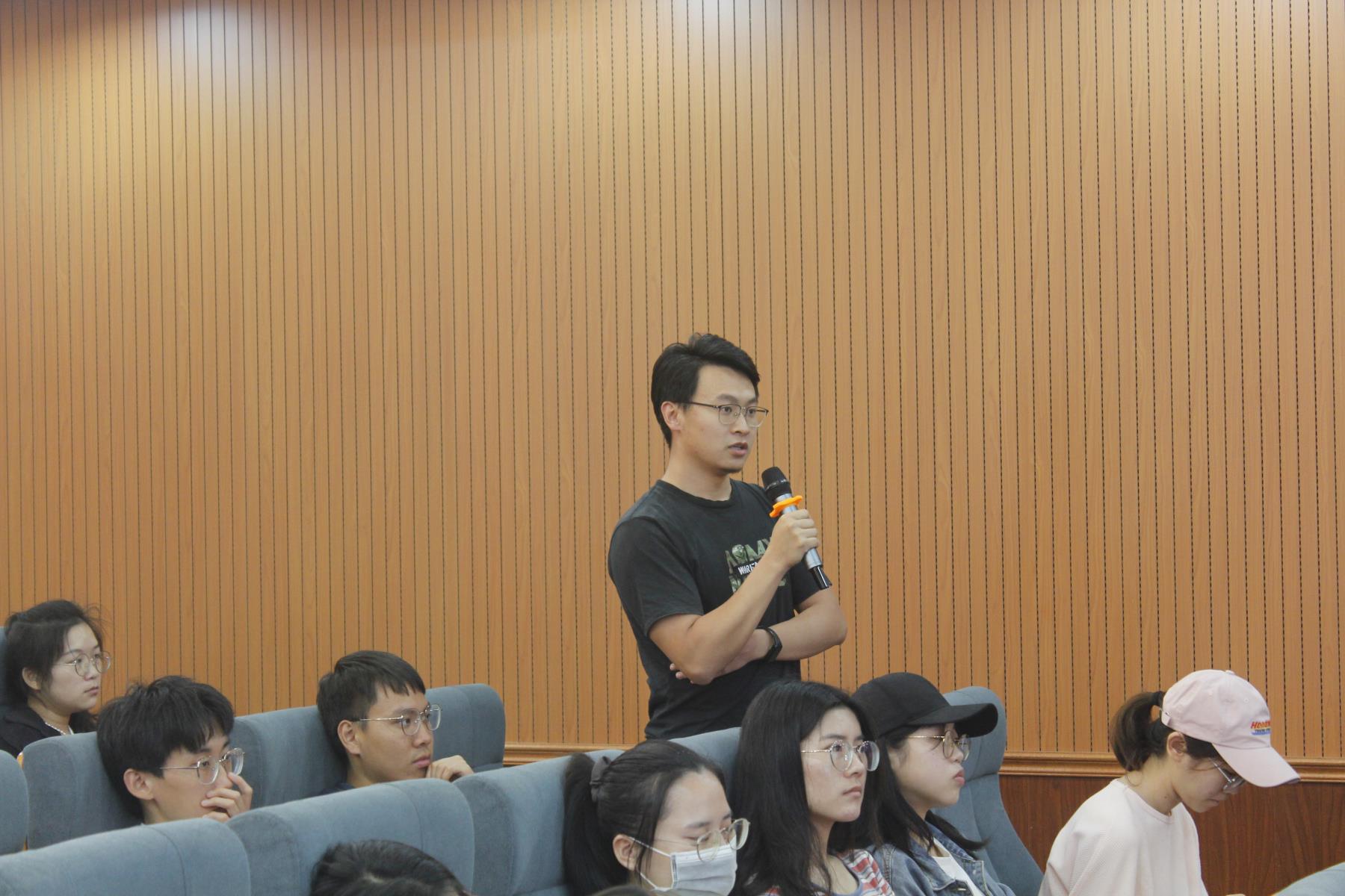 林宏阳老师首先以物理海洋学为视角进行科普分享,他分别从大尺度环流、中尺度过程(涡旋、锋面)和小尺度过程(湍流混合、扩散)来描述核污水入海后的运动情况及对中国沿海区域的影响。并通过模型模拟实验,使同学们更加直观地了解了核污水的运动情况,引导学生用科学、理性的思维来看待问题,避免盲目跟风。谢腾祥博士紧接着从海洋化学的角度对“核废水入海”事件的发生、处理过程以及放射性核素进行了专业的解读。谢博士表示作为海洋学子,要以专业知识为基础来看待此事件以及事件带来的问题,不仅要考虑当下,更要放眼未来,不仅要关注伦理问题,更要关注行为本身的影响。随后,现场同学积极互动,踊跃提问,也充分表达了自己的想法。