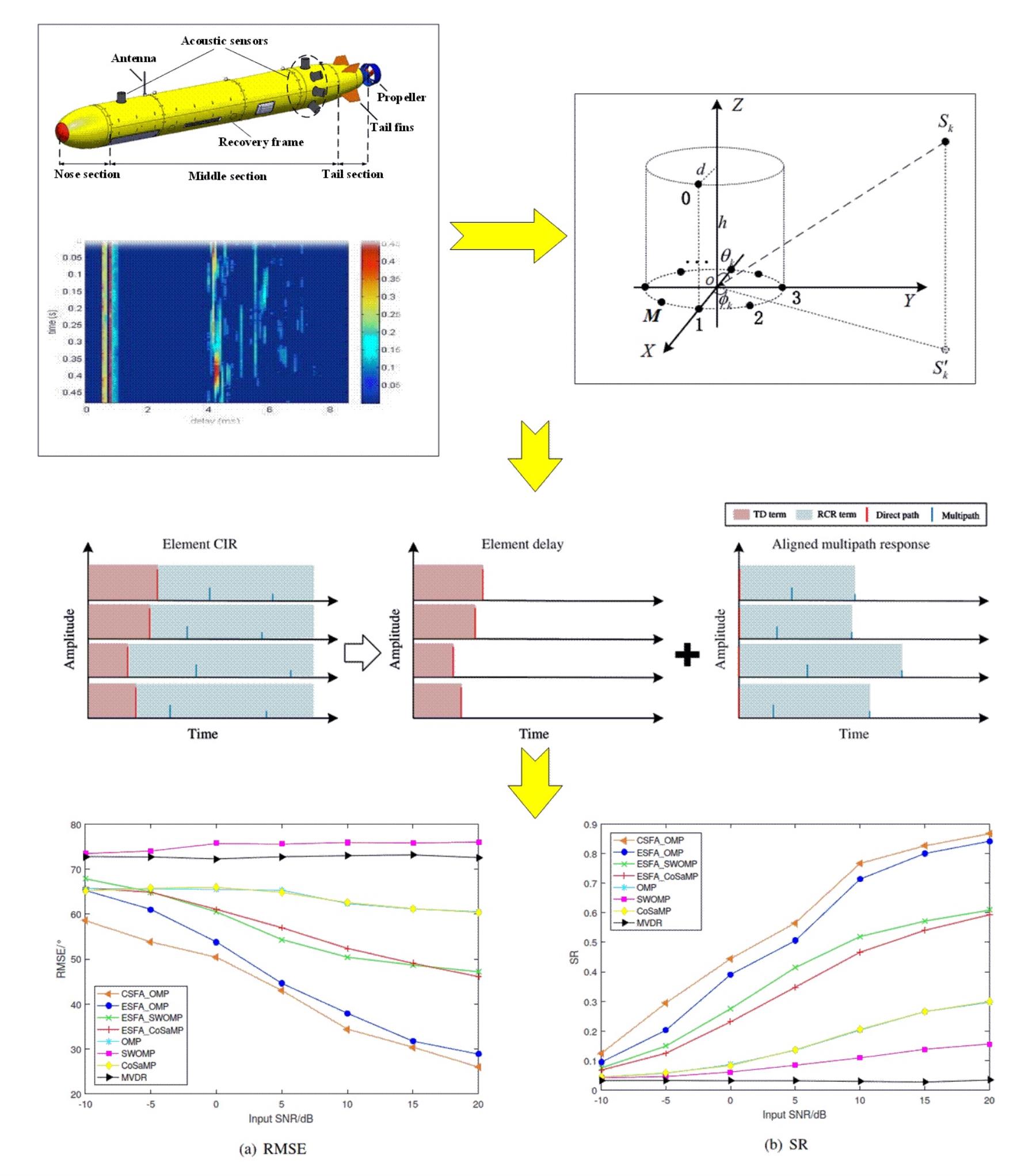 童峰教授团队利用水下目标存在空间稀疏性这一特征,将小尺寸水声阵列DOA估计转化为空间稀疏恢复问题。考虑到水声信道条件下不同DOA对应每个阵元具有不同的传输响应模式,水下目标DOA与阵元对应传输响应之间具有极强的相关特性,由此关联特性可定义方向相关传输响应(DDTR)。在此工作的基础上,研究团队提出了一种基于DDTR的小尺寸水声阵列DOA估计方法。该方法通过将DDTR分解为时延项(TD)和随机信道响应项(RCR)解耦水声信道多径的不利影响,并从小尺寸阵列几何结构出发,将每个与水下目标DOA关联的TD构造为字典矩阵;与此同时,设计了不同准则的选择性频率累加压缩感知重构算法(SFA-CS)来重构DOA。数值仿真结果表明,与传统算法相比,该方法可有效提高小尺寸阵列水下目标DOA性能,获得更低的均方根误差(RMSE)和更高的成功率(SR),且对多普勒频移具有较强的鲁棒性。