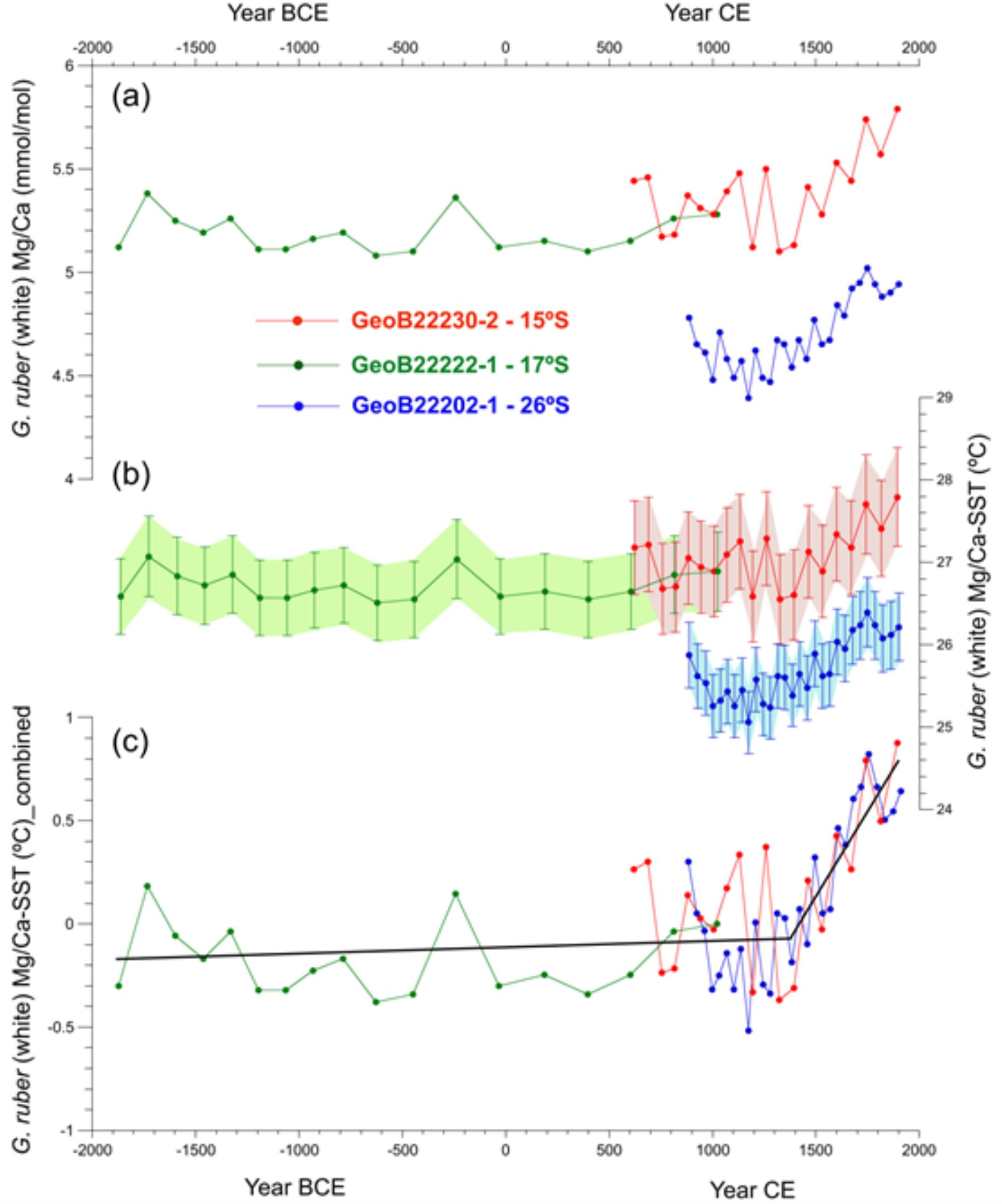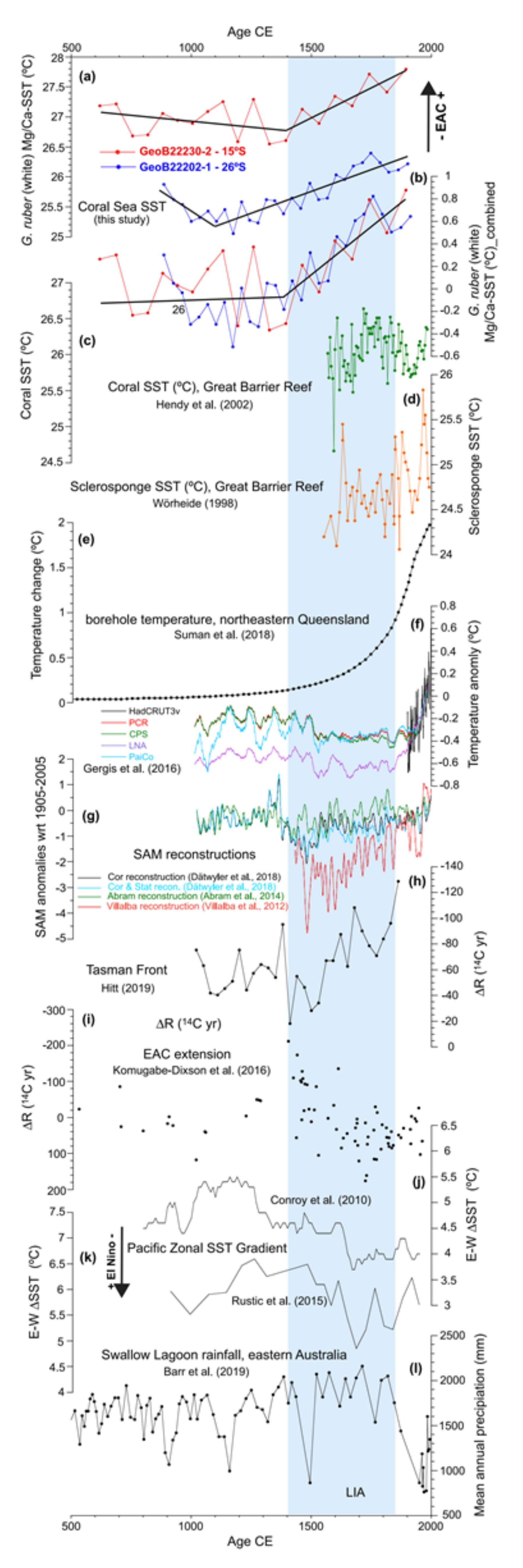 研究团队利用多管取样器获得了东北澳大利亚大陆坡(15°S 至 26°S)的柱状沉积物,基于浮游有孔虫Globigerinoides ruber (white)壳体的Mg/Ca比值,重建了该海域过去4000年的海表温度变化。结果显示,公元前2000年至公元1400年左右,海表温度相对稳定,而公元1400年以后该海域出现了持续升温,升温幅值达1.2℃。这一结果与前人基于珊瑚与海绵重建的海表温度以及基于东北澳大利亚陆上钻孔数据重建的陆地气温具有很好的一致性。